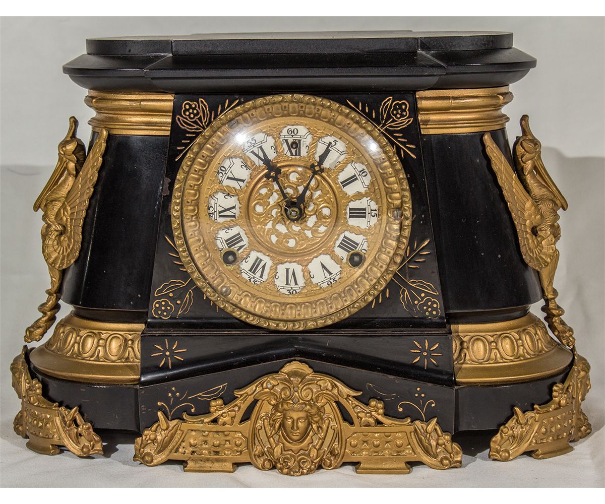 c1880 Blaqck cast iron Ansonia mantle clock, "Pompeii" model, with golden Egytian Ibises on either side of the case. Measures 10.75" high, 15" wide & 6" deep. It weighs approx. 25 lbs. This clock features an 8-day Gilbert movement, which underwent a full restoration in late 2006. The clock has very ornate gold trims at the base and sides, and has gold inlays around the clock face. The clock face itself is also quite detailed. The gold base trim below the clock features another sculpted face. Rare and unusual, a striking addition to any home. Fairbanks Collection - HKA#66040