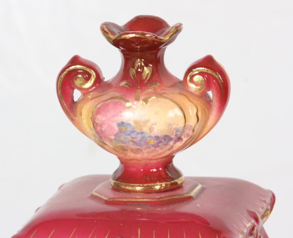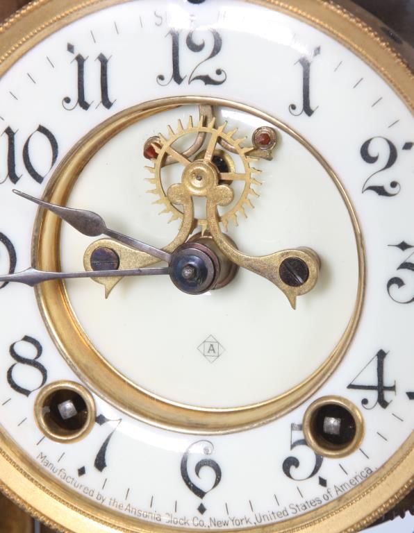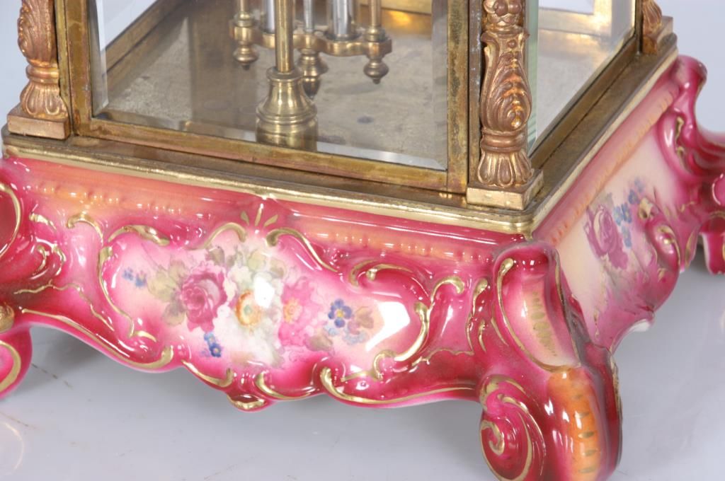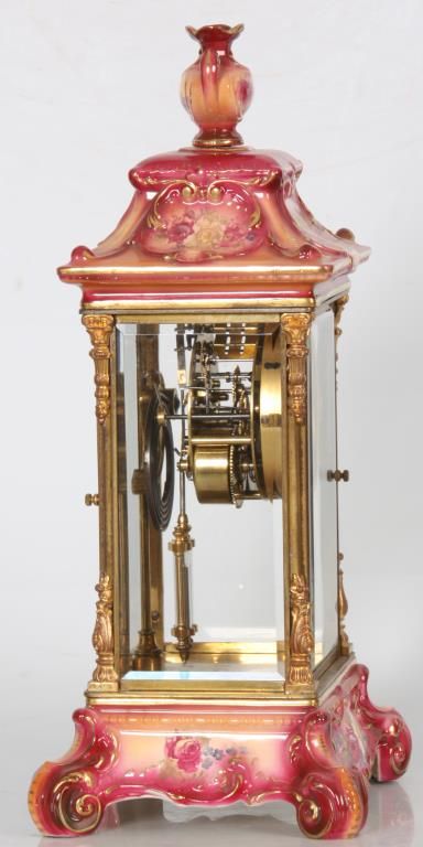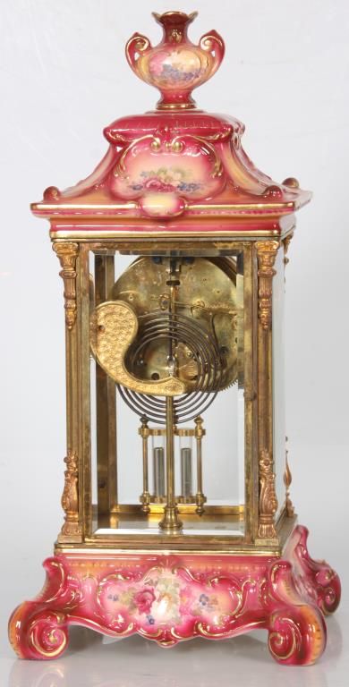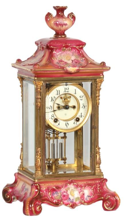 Ansonia Porcelain Crystal Regulator No. 1. Inset 4 in. porcelain dial has black hour numbers with exposed Brocot escapement and jeweled pallets, signed with Ansonia trade mark, has black hands and brass bezel; brass 8 day spring driven movement signed Ansonia Clock Co., half hour coiled gong rack & snail strike and gilt brass pendulum with jeweled bob. In a porcelain case with filigree design and large center finial, pink floral decoration with gilt highlights; the body of the case has gilt brass mounted corners with filigree design, beveled glass on the doors and sides; signed Royal Bonn on the bottom of the case. In very good running condition. 18 in. high x 9 in. wide x 8 in. deep.