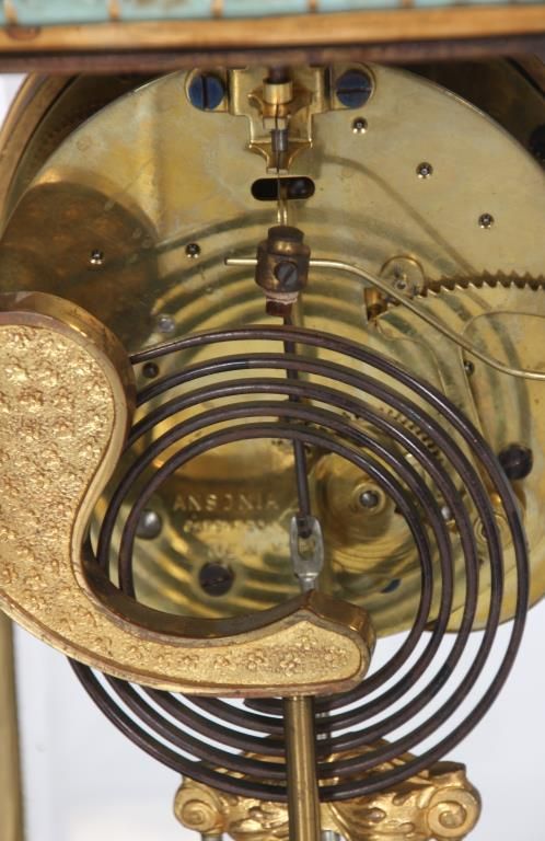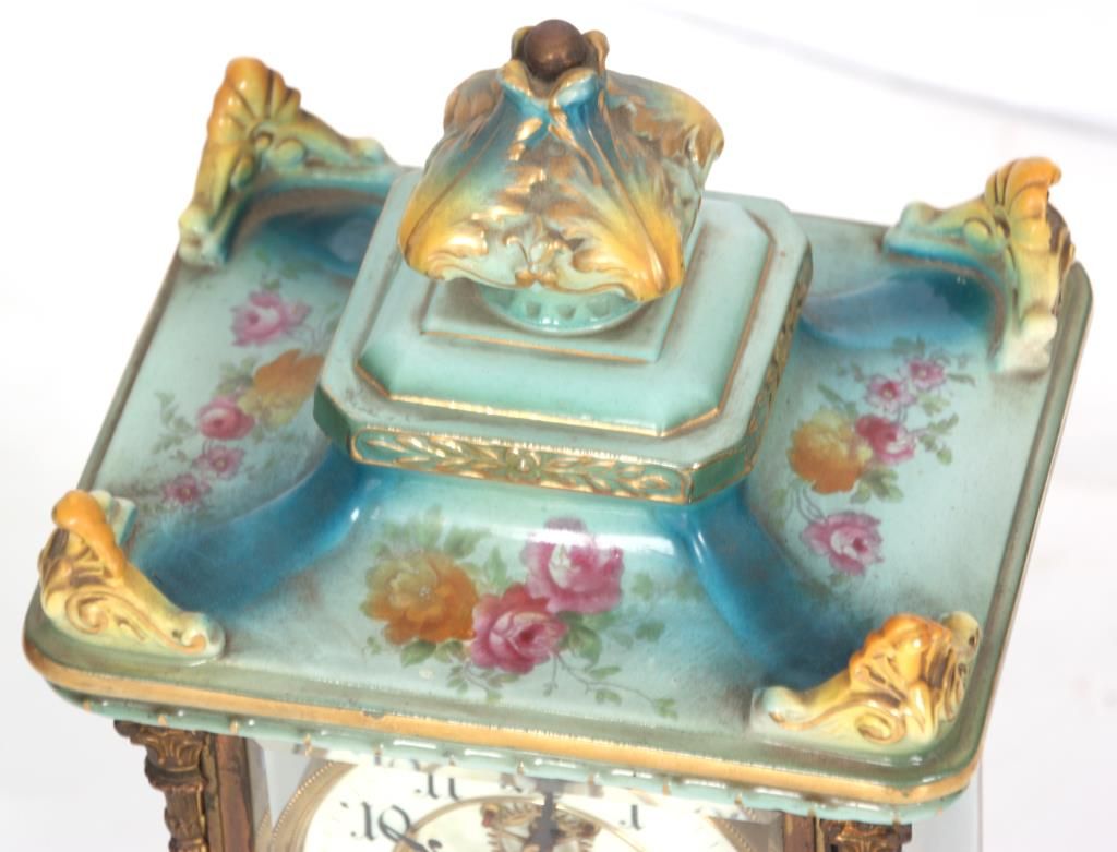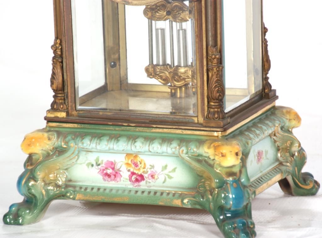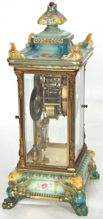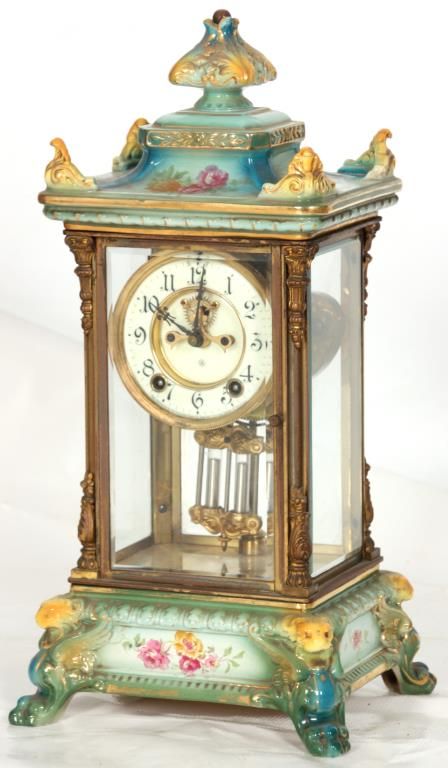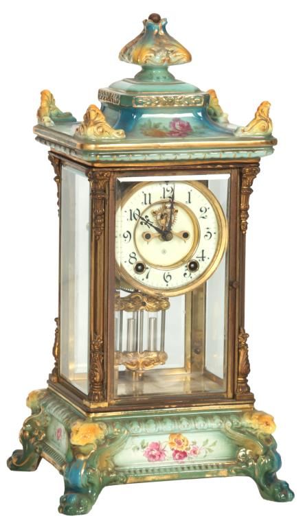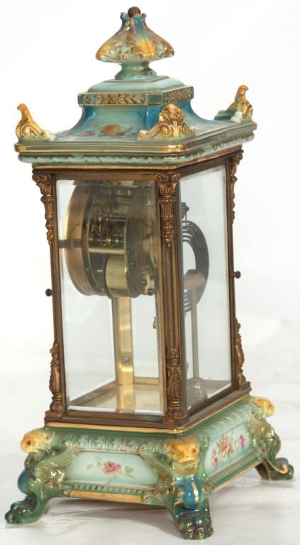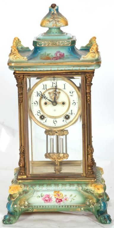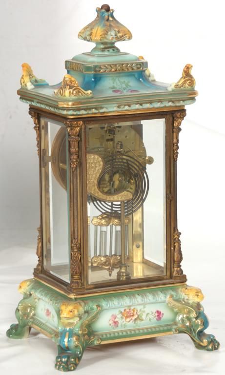Ansonia Porcelain Crystal Regulator No. 6. Inset 4 in. porcelain dial has black hour numbers with exposed Brocot escapement and jeweled pallets, signed with Ansonia trade mark and has black hands and brass bezel; brass 8 day spring driven movement signed Ansonia Clock Co., has an half hour coiled gong rack & snail strike and gilt brass pendulum with jeweled bob. In a porcelain case having winged lions heads over claw feet on the base, scrolled sea shells on the top corners and large center finial in green, blue and yellow with gilt and floral highlights; the body of the case has gilt brass mounted corners with filigree design, beveled glasses on the doors and sides. In very good running condition. 17 in. high x 9 in. wide x 8 in. deep.