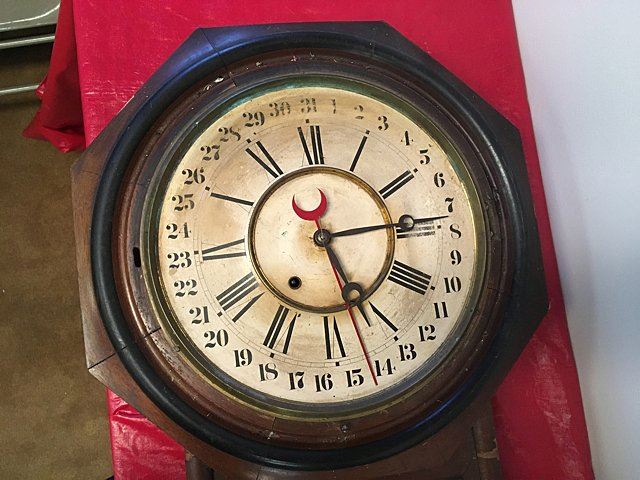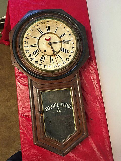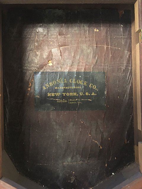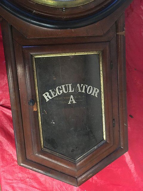 Ansonia Regulator A Calendar Wall Clock, calendar dial with second hand, nice label "Ansonia Clock Co., Manufacturers, New York, U.S.A. Factories, Brookly, NY Ansonia, Conn.", Measures approx. 32" tall x 17" wide x 4" deep.