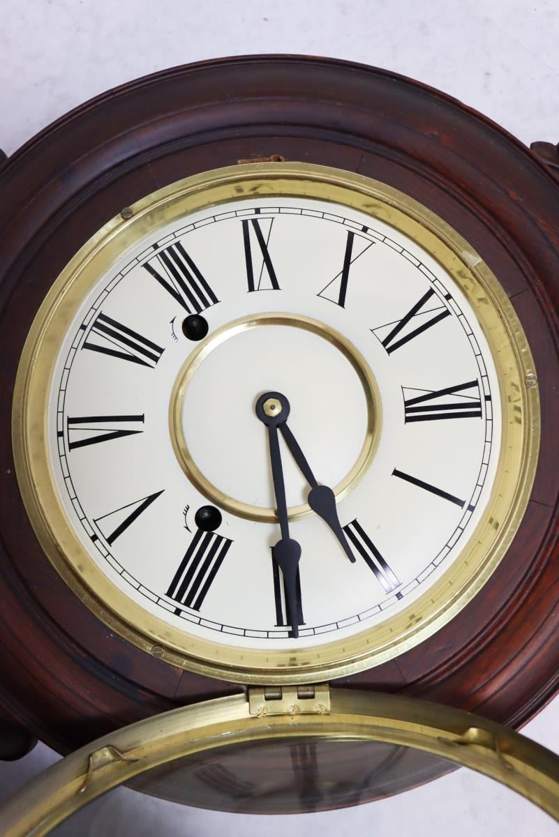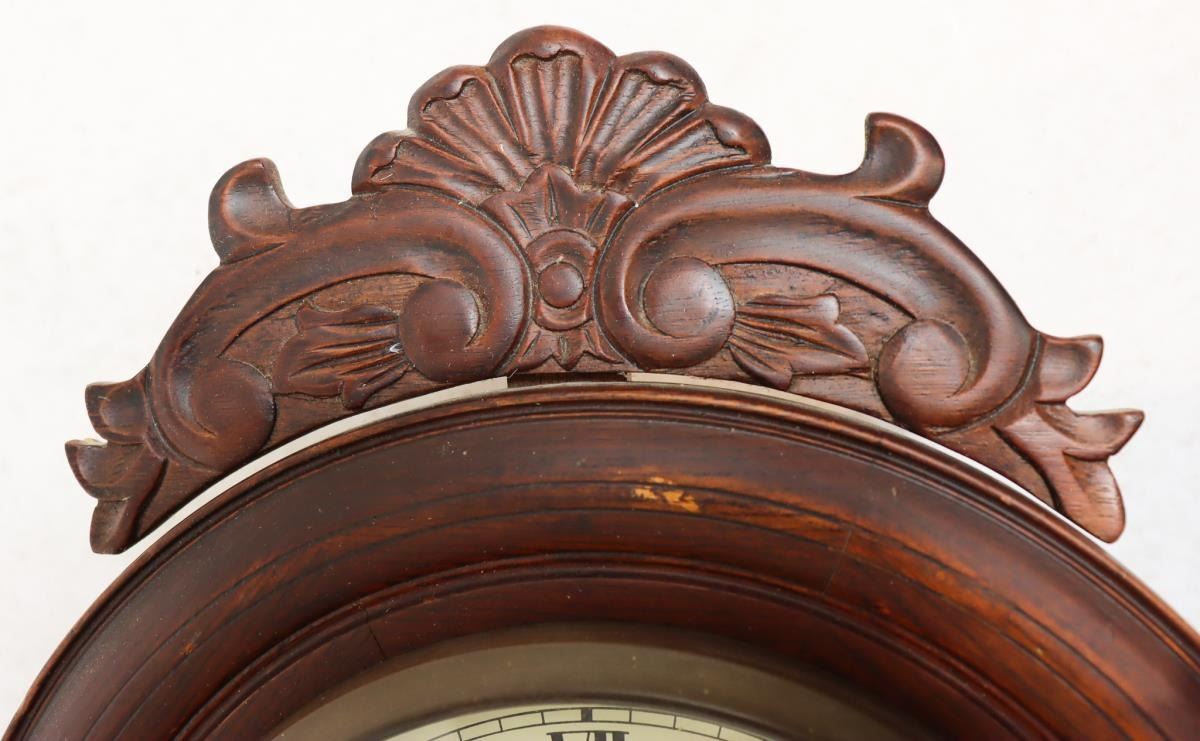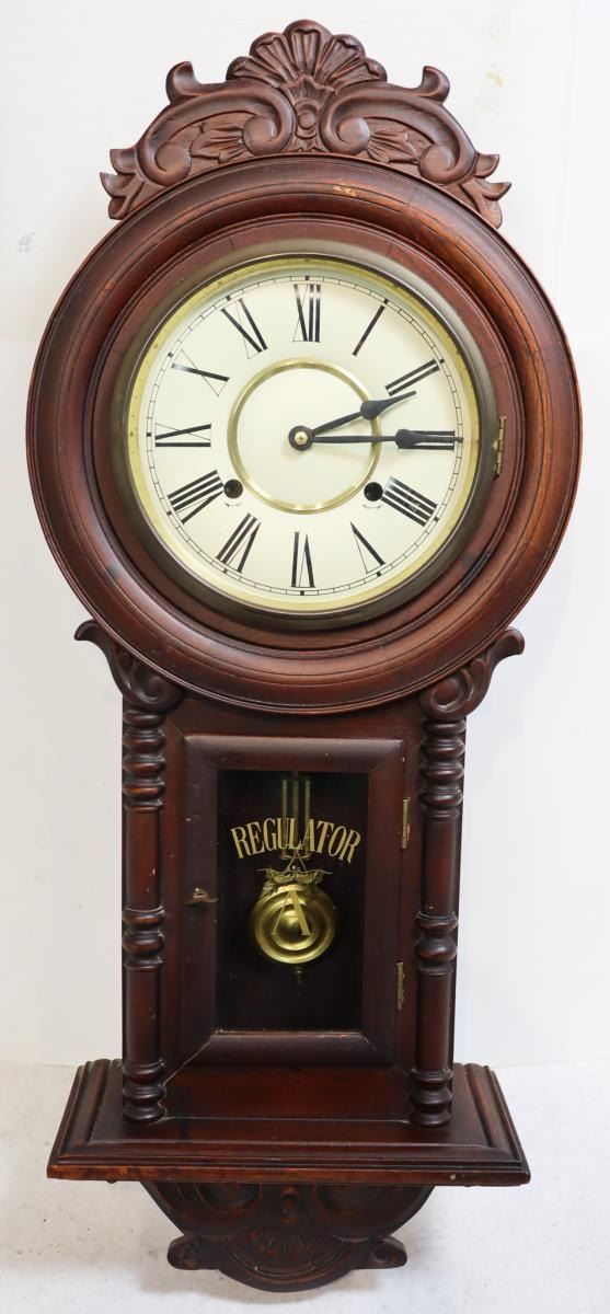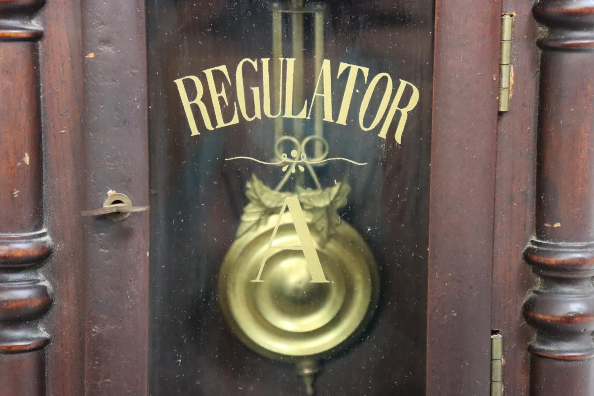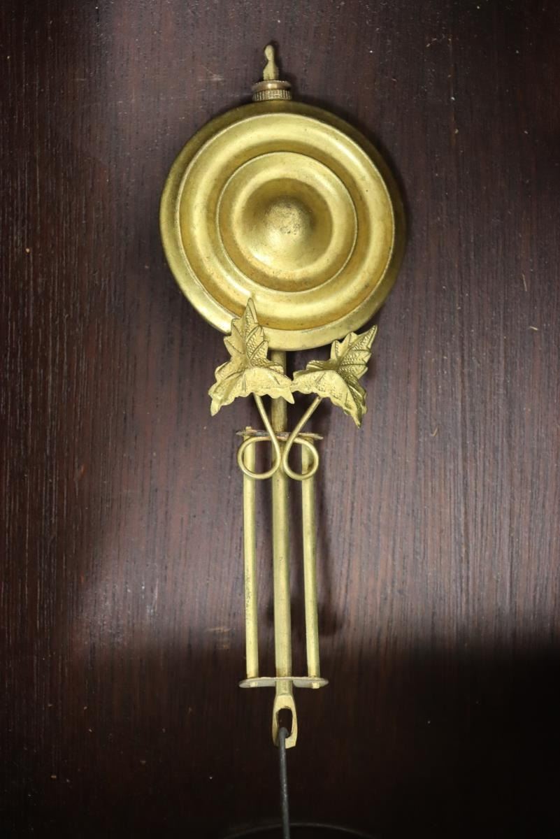 This is a lovely wooden wall hanging clock with painted glass door and pendulum.