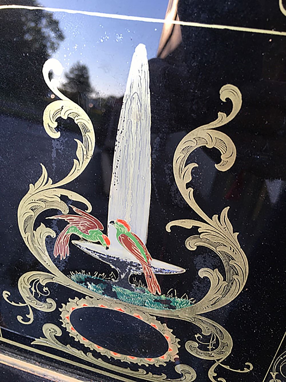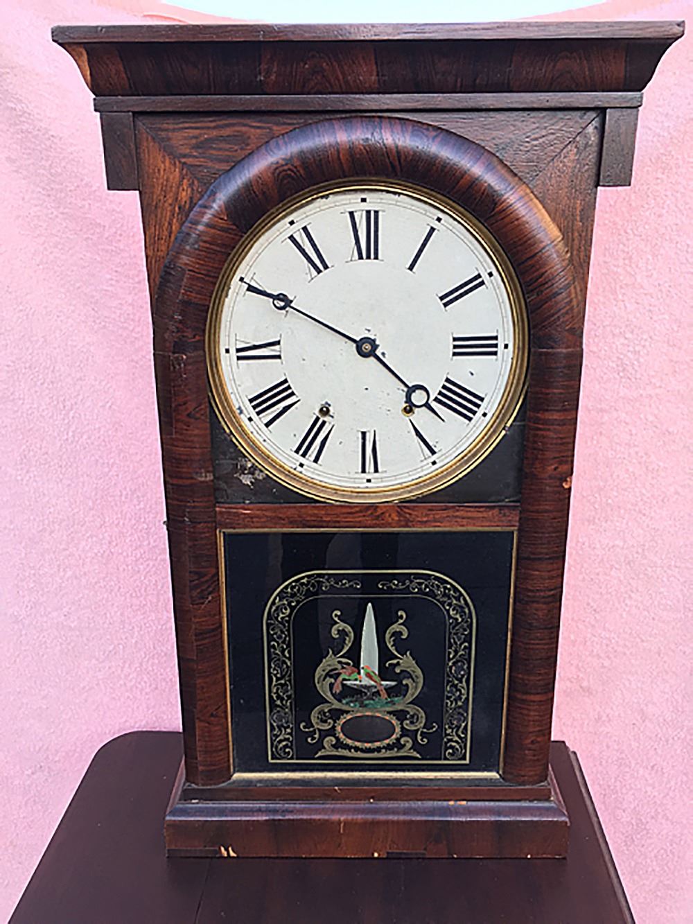 Ansonia Rosewood 8 Day Shelf Clock. Beautiful label, "Patent Brass Clocks, Ansonia Brass and Copper Company, Ansonia, Conn.", original rosewood case, reverse painted birds on fountain on glass, key wind, pendulum, measures approx. 33" tall x 17 1/2" wide x 5" deep. Stampled on back, "C.R.I. Ieizman & Cro. Redding, PA".