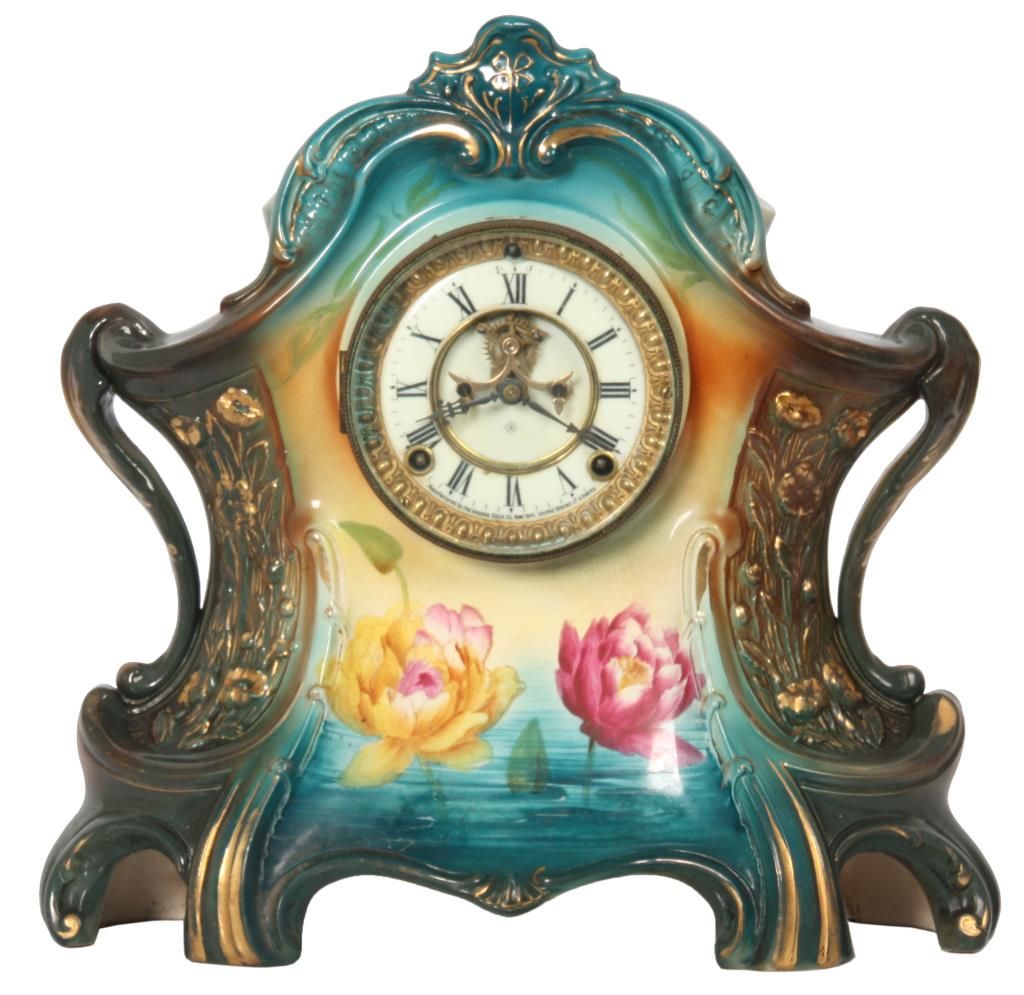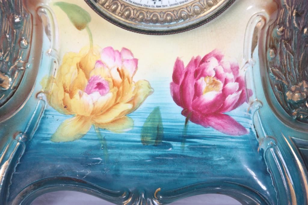 Ansonia Royal Bonn China Clock “La Layon”. 4 in. porcelain inset dial has black hands, exposed Brocot escapement and fancy gilt brass bezel with door glass; brass 8 day spring driven movement signed Ansonia Clock Co., has half hour coiled gong strike. In a singed Royal Bonn case with colors of green and aqua with gilt trim, colorful water lily flowers and relief decorated filigree on the sides. In good condition with no breaks, cracks or repairs, missing pendulum and rear door. 14 in. high x 14 in. wide x 5.25 in. deep.
