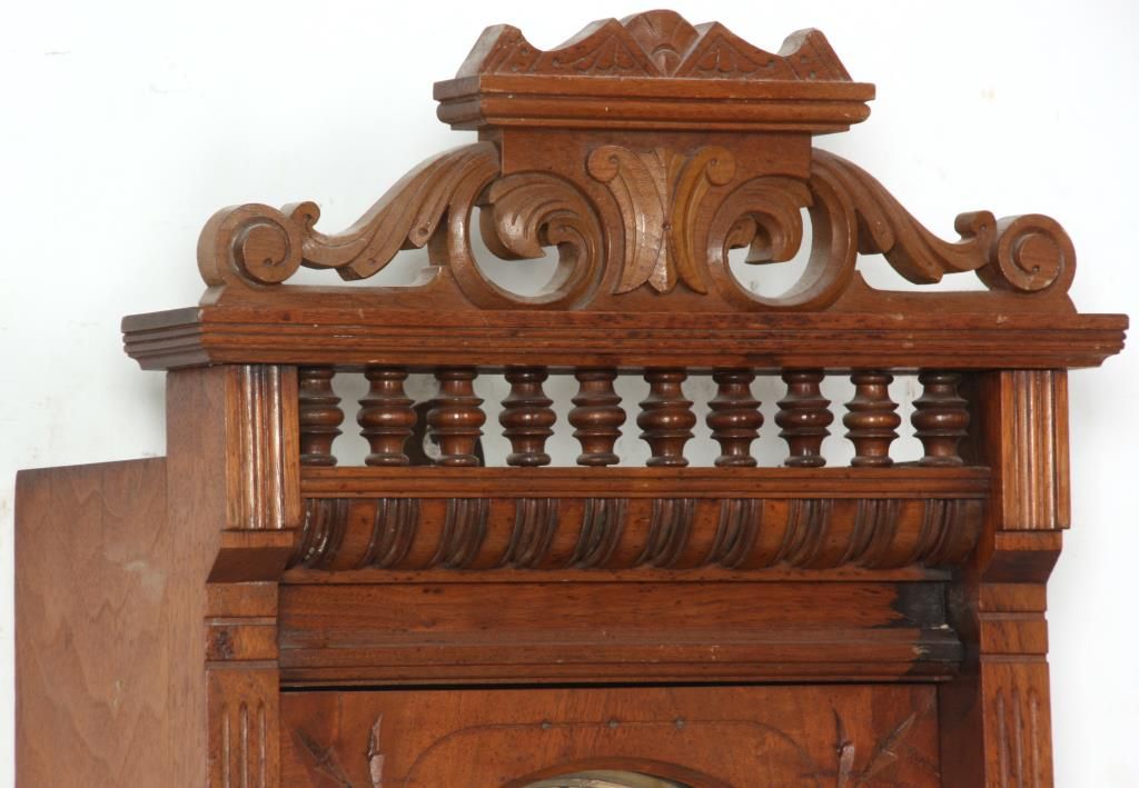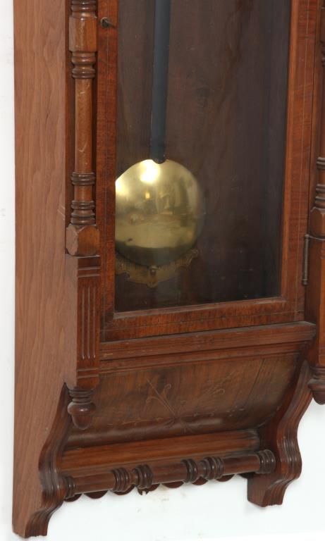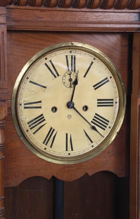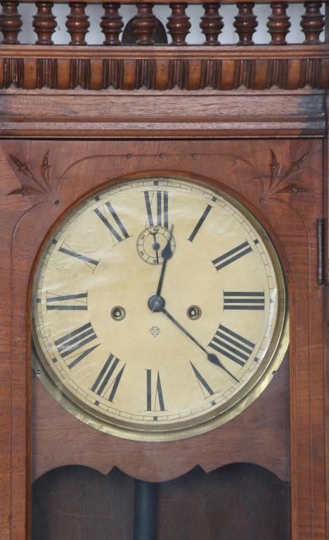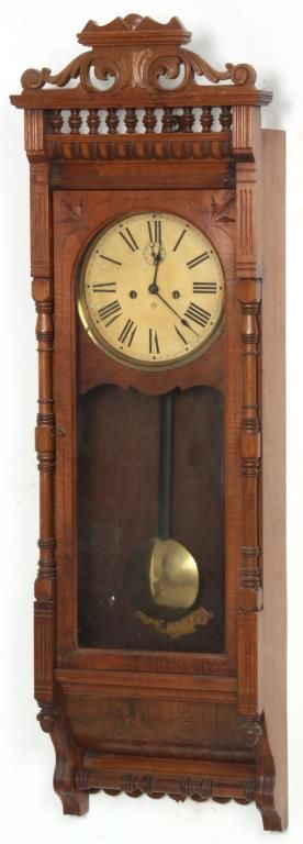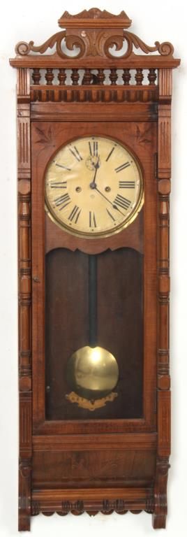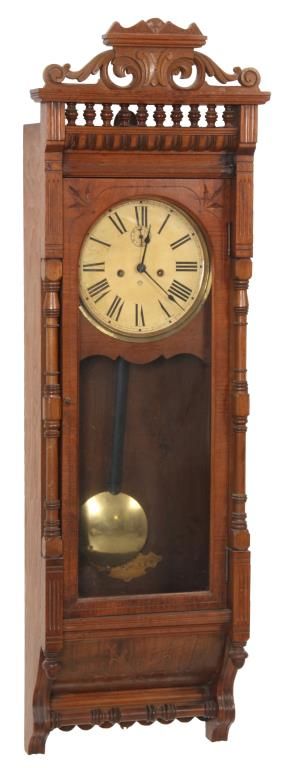 Ansonia “Santa Fe” Weight Driven Wall Regulator. 10 in. paper dial has black Roman hour numerals, blued spade hands and sub seconds dial; 8 day, brass, time only movement has Graham deadbeat escapement with 2 brass covered side weights and brass pulleys. In walnut case with swirling filigree carved crest over a spindled section, long turned columns on the sides of the door and teardrop finials over a turned crossbar at the bottom. In good condition and excellent original finish. 52 in. high x 16.5 in. wide x 8.5 in. deep.