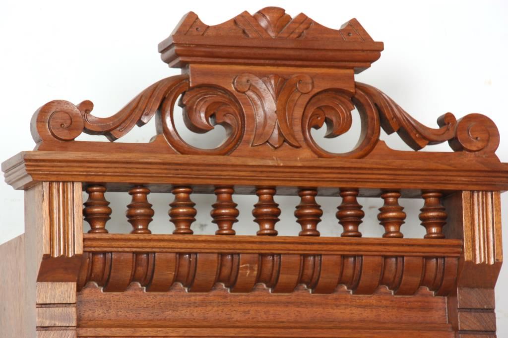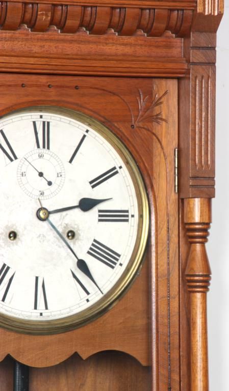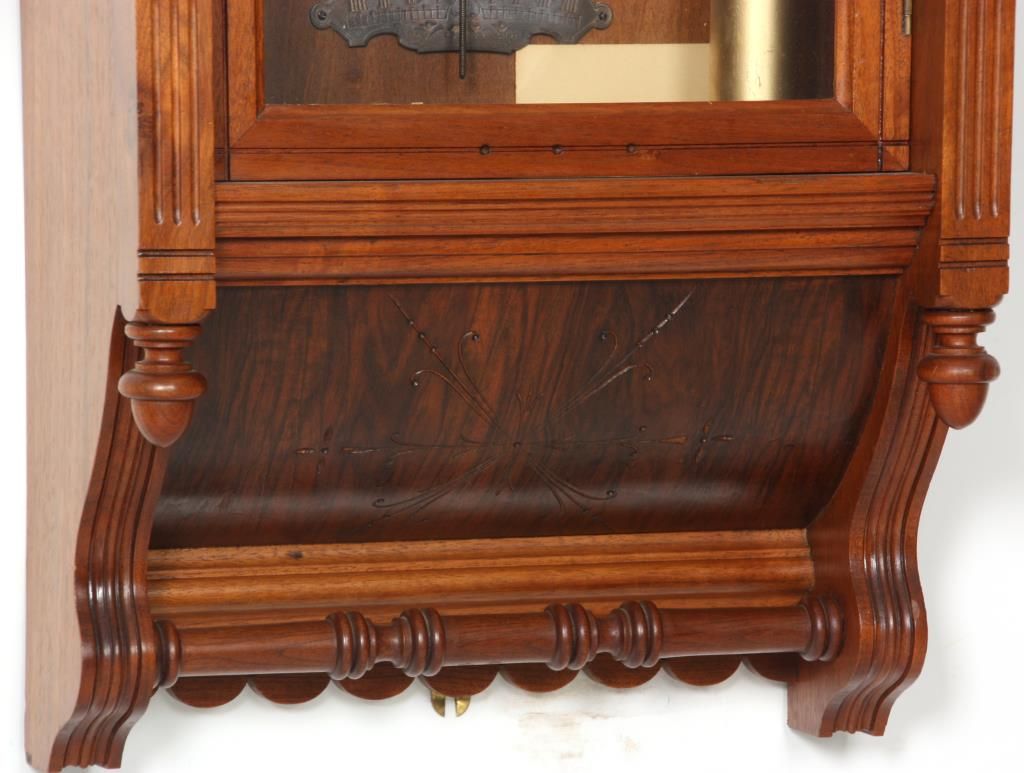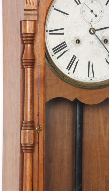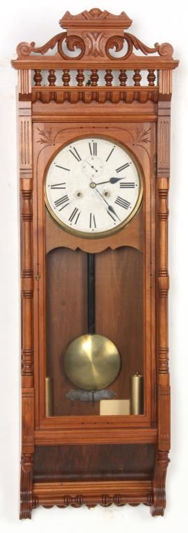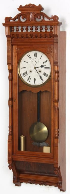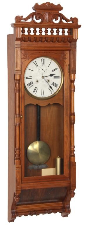 Ansonia “Santa Fe” Weight Driven Wall Regulator. Original 10 in. paper dial has black Roman hour numerals, blued spade hands and sub seconds dial; 8 day brass time only movement has a Graham deadbeat escapement with 2 brass covered side weights and brass pulleys. In a walnut case with swirling filigree carved crest over a spindled gallery, long turned columns on the sides of the door and teardrop finials over a turned crossbar at the bottom. In good condition and excellent original finish. 52 in. high x 16.5 in. wide x 8.5 in. deep.