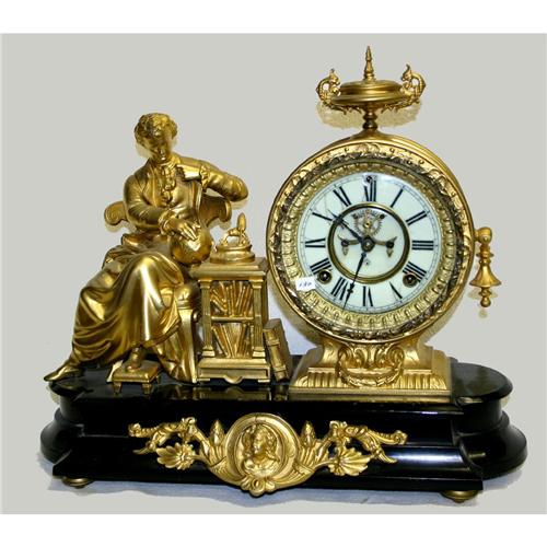 Ansonia Statue Clock - Porcelain dial with Roman Numerals and minute ticks is marked with A within a square & diamond.  Open excapement.  Measures approximately 7 ½" x 17 ½" x 15 ½" H.