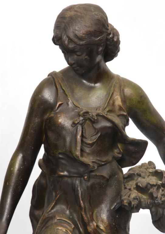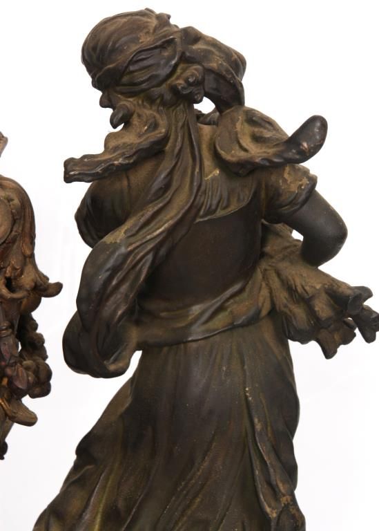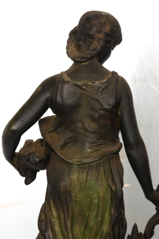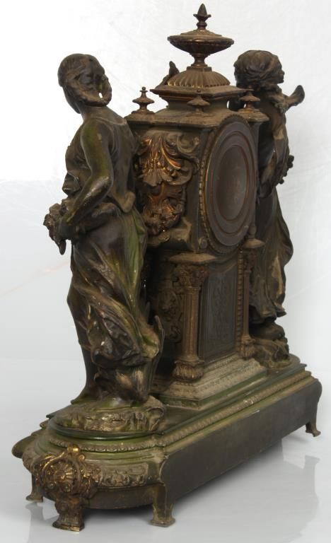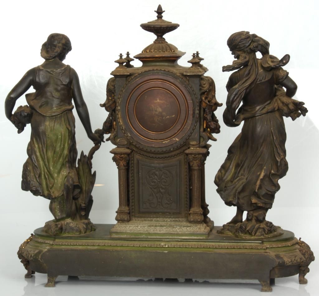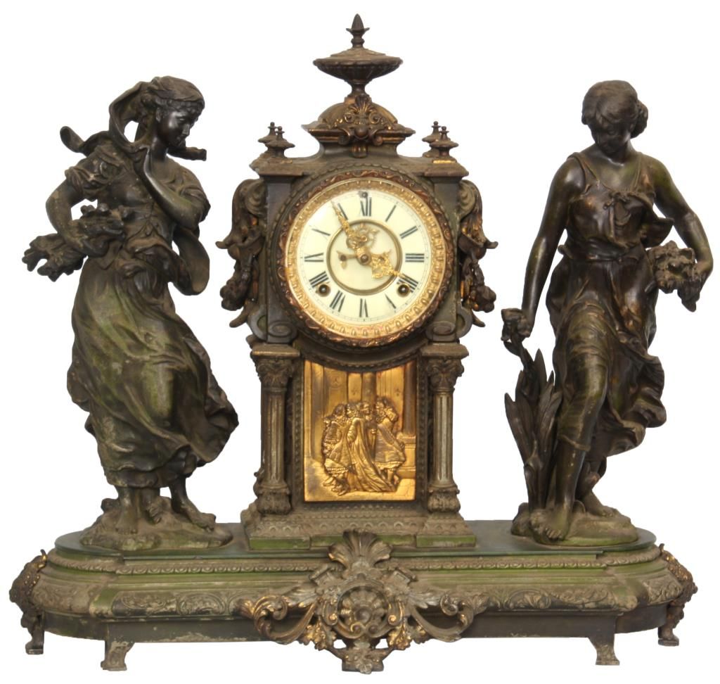 Ansonia Double Figure Mantle Clock “Summer & Winter”. Pr. standing maiden figures, one of a woman wearing a winter dress blowing in the breeze, she holds a bundle of wheat under her arm and a shawl over her shoulder, the other stands among tall grass with a bundle of flowers in her arms; the figures are turned facing the center of the case with the large clock tower in the center. Original verde green patinated case. Has a 5 in. inset porcelain dial with black Roman hour numerals, fancy pierced gilt hands and exposed Borcot escapement; brass spring driven 8 day movement signed Ansonia Clock Co. and strikes on a coiled gong. 22 in. high x 24 in. wide x 7 in. deep.