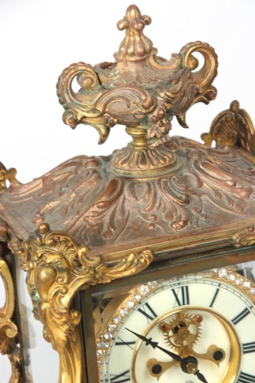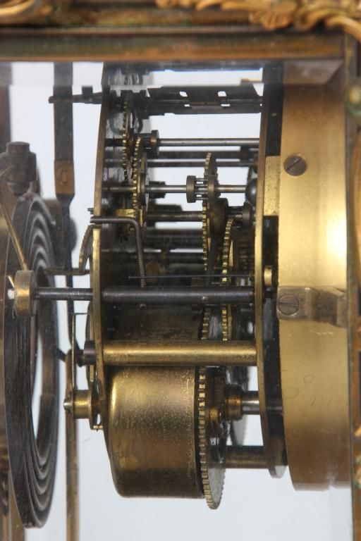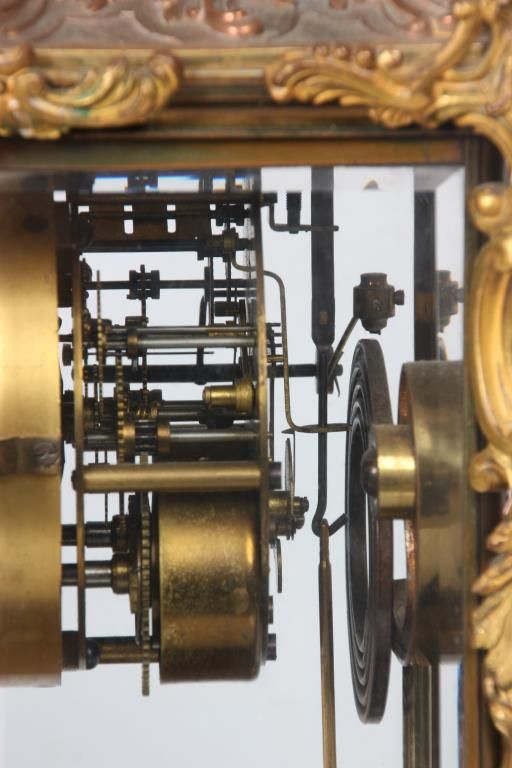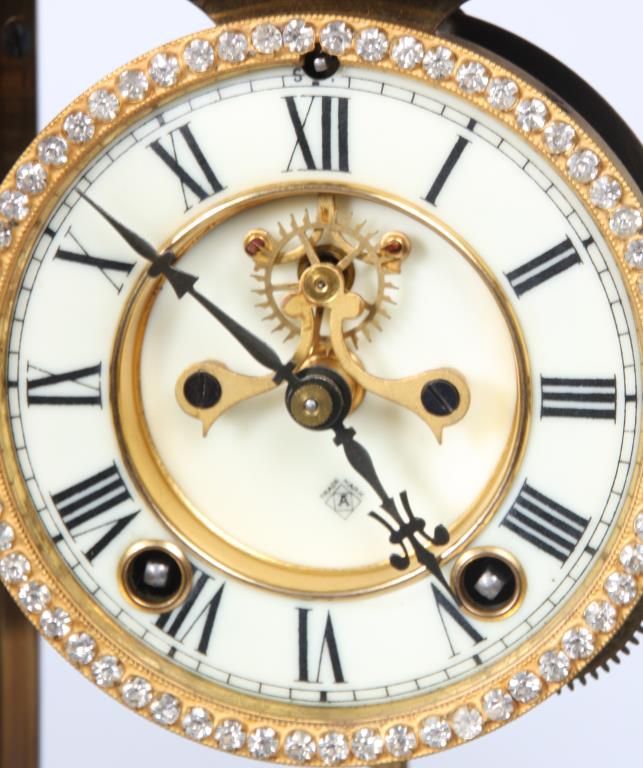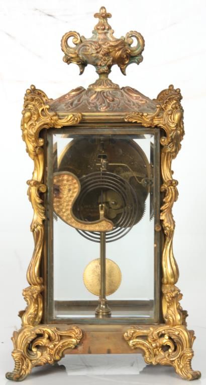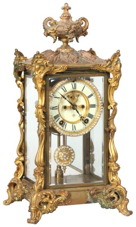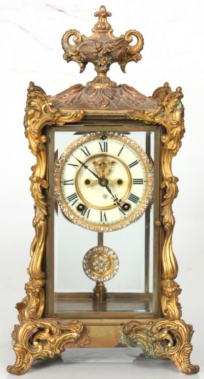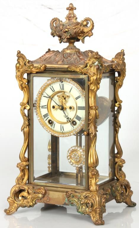 Ansonia “Viscount” Crystal Regulator. 4 in. inset porcelain dial has black hour numbers with exposed Brocot escapement and jeweled pallets, signed with Ansonia trade mark and has black hands and jeweled bezel; brass 8 day spring driven movement signed Ansonia Clock Co., has an half hour coiled gong, rack & snail strike and gilt brass pendulum with jeweled bob. In a gilt brass “Viscount” model case with urn finial, heavy filigree design, beveled glasses on the doors and sides. In very good running condition. 16 in. high x 8.25 in. wide x 7 in. deep.