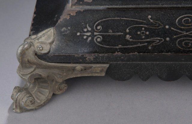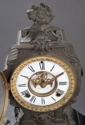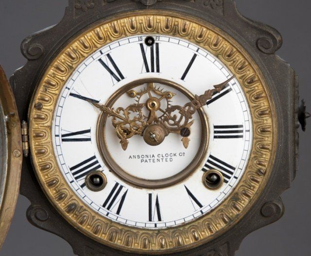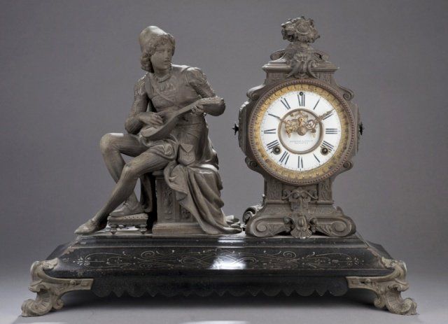 Ansonia spelter mantle clock with figure playing instrument. Marked on movement, "Ansonia Clock Co. Patented June 14, 81 New York USA". 15 1/4"h x 21"w x 8"d.