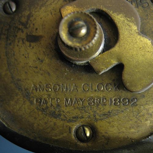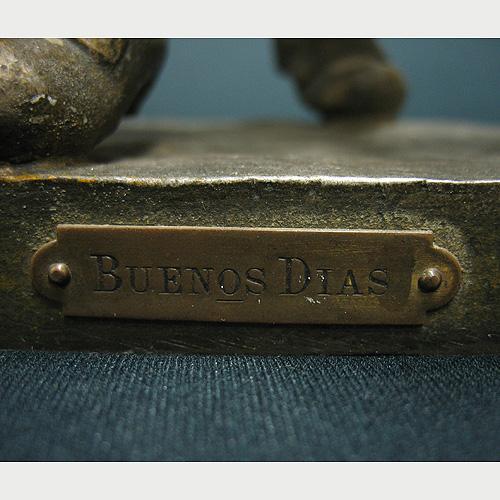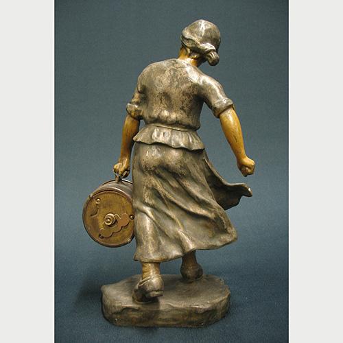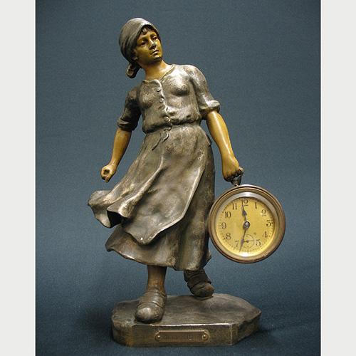 Ansonia novelty eight day clock painted spelter figure of woman carrying clock; metal tag on base "Buenos Dias"; late 19th to early 20th C.; 12" high (paint wear on nose)