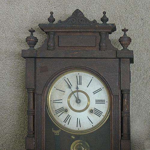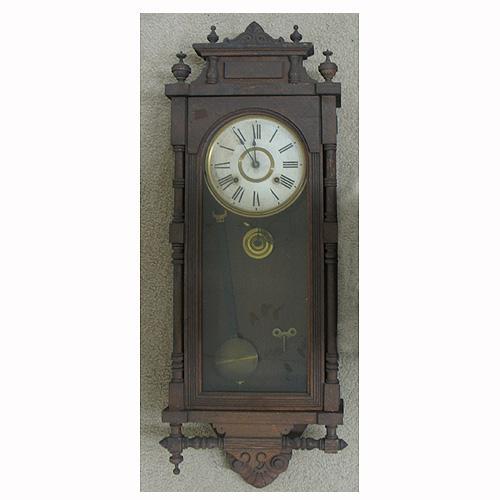 Ansonia regulator wall clock; eight day, in walnut case, spring; 8" dial; C.1920; 37" high (wear to finish)