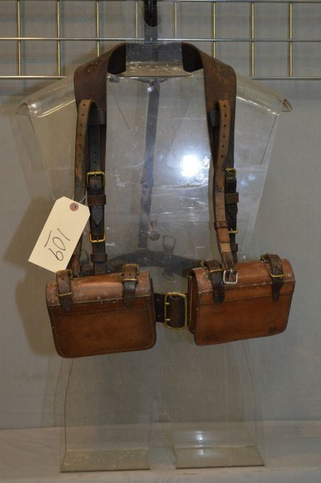 Ant Leather Shoulder Harness w/ two pouches, displayed on small plastic display