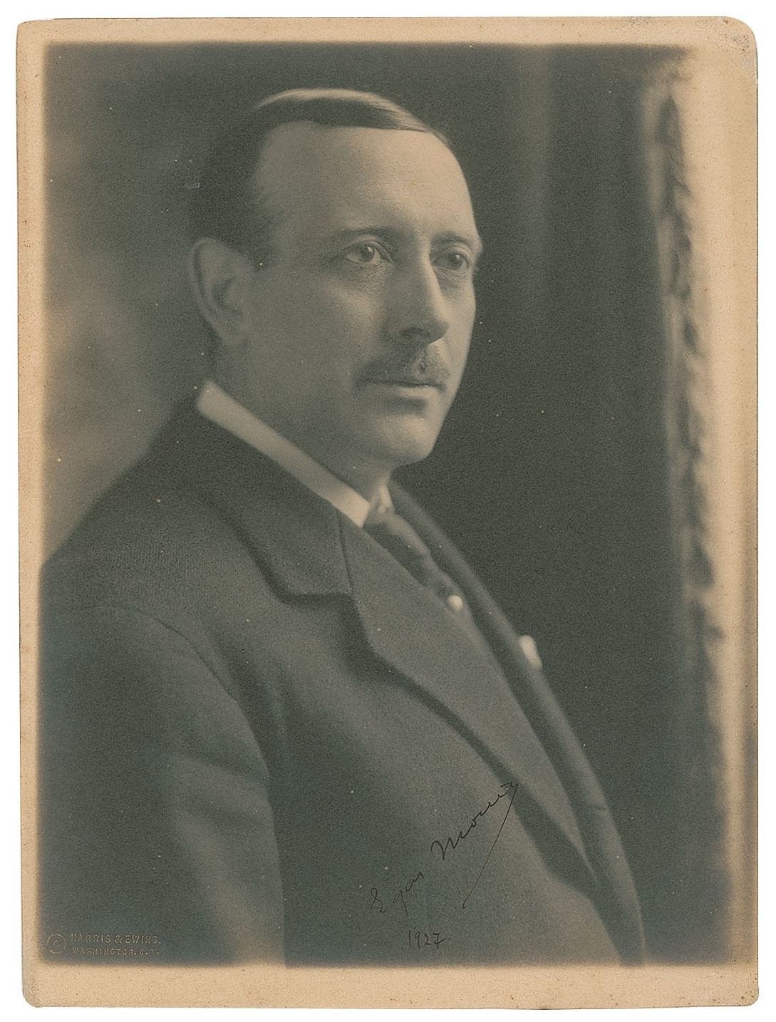 Portuguese neurologist (1874–1955) who received the Nobel Prize in Physiology or Medicine in 1949; regarded as one of the founders of modern psychosurgery, having developed the surgical procedure leucotomy, which is more widely known as lobotomy. Unusual 7.5 x 10 paperstock photo of Antonio Egas Moniz with a Harris & Ewing blindstamp in the lower left corner, signed in black ink, "Egas Moniz, 1927." In fine condition.