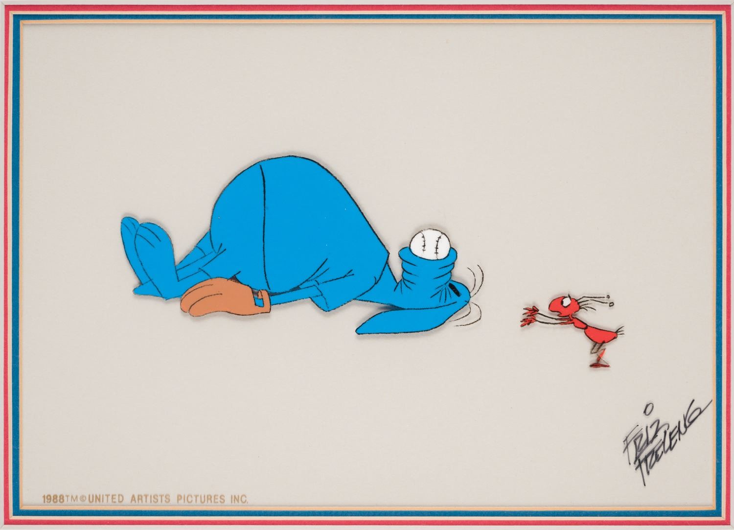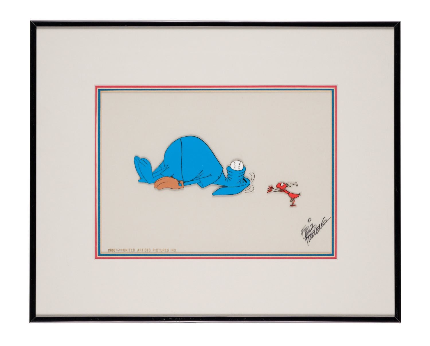 (DePatie-Freleng, 1988) A Friz Freleng signed production cel featuring the Ant & Aardvark from The Pink Panther Show. The untrimmed cel measures 10.5"x12.5" and the characters' image size is 3.5"x7.5". The cel is in fine condition.