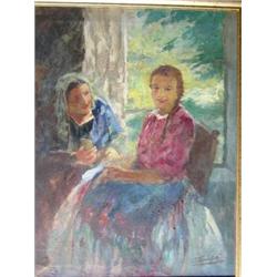 Antal (Anton) Peczely (Hungarian, 1875-1949) A Girl with her Mother, reading Letters before an Open.