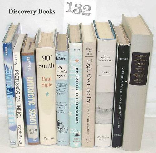 Antarctic. Americans in the Antarctic. (1) Bertrand, Kenneth J. AMERICANS IN ANTARCTICA 1775-1948. New York, 1971 554pp. Maps. Cloth, very good. (2) Mitterling, Philip I. AMERICA IN THE ANTARCTIC TO 1840. Urbana, IL, 1959. 201pp. Cloth, very good ind/j. (3) Tyler, David B. THE WILKES EXPEDITION. THE FIRST UNITED STATES EXPLORING EXPEDITION (1838-1842). Philadelphia, 1968 435pp. Illus. Cloth, fine in d/j. (4) Joyner, Christopher C. & Ethel R. Theis. EAGLE OVER THE ICE. THE U.S. IN THE ANTARCTIC. Hanover, NH, (c.1997) 303pp. Cloth, very good. (5) Ronne, Finn. ANTARCTIC COMMAND. Indianapolis, (c.1961) 272pp. Illus. Cloth, very good in d/j. (6) Darlington, Jennie & Jane McIlvaine. MY ANTARCTIC HONEYMOON. New York, 1957 284pp. Cloth, very good in d/j. (7) Siple, Paul. 90 SOUTH. THE STORY OF THE AMERICAN SOUTH POLE CONQUEST. New York, (c.1959) 384pp. Illus. Cloth, very good in d/j. (8) Chappell, Richard Lee. ANTARCTIC SCOUT. New York, 1959 205pp. Illus. Cloth, ex.library, endpaper out, tape marks. Good, in d/j. (9) Mason, Theodore K. TWO AGAINST THE ICE. AMUNDSEN AND ELLSWORTH. New York, (c.1982) 192pp. Illus. Cloth, fine in d/j. (10) Feeney, Robert. PROFESSOR ON THE ICE. Davis, CA, (c.1974) 164pp. Illus. Softbound, very good. (10)