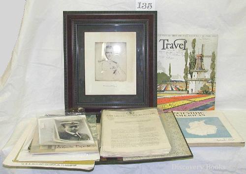 Antarctic. Ephemera. (1) BERGY BITS OPERATION HIGHJUMP, TASKFORCE 68. U.S.S. MOUNT OLYMPUS, FLAGSHIP. Special Souvenir Edition April 1947. Folio (11" x 14"), 16pp. Many photo illus taken during operations. Illustrated wrapper, very minor edge chips & tears, generally very good. Signed on back by Byrd. (2) McKinley, Ashley. THE SOUTH POLE PICTURE BOOK. New York, c.1934 Many illus, Lg. magazine format. Two copies, one very good, one good. (3) HIGHLIGHTS OF THE BYRD ANTARCTIC EXPEDITION. Published by Tidewater Oil Co, c.1930 Lg. magazine format, many illus. Very good. (4) Prints. Two sets of 6 color prints each, from dwgs. & watercolors by Edward Wilson, issued by Scott Polar Research Inst., aprox 8" x 12", plus two others, slightly larger, all very good. (5) Sm. group of photographic prints, apparently photos of original photographs or art. Six 5" x 7", Eight 8" x 10". (6) SCIENTIFIC AMERICAN Magazine, September, 1962. Complete issue, devoted to "The Antarctic". (7) TRAVEL MAGAZINE, Feburary, 1932. Complete issue with 5pp. illustrated article "Hunting Whales in the Antarctic" by A. J. Villiers. (8) ANTARCTIC NEWS BULLETIN, Published by the New Zealand Antarctic Society, 12 issues; Nos. 5-7, 9, 12-13, 15-20, 1952-55. Mimeographed, one side only. Good. (9) framed Print of drawing of Adm. Byrd by Walter Tittle, Aprox. 8" x 10". Lightly toned along top & side margin. (10)