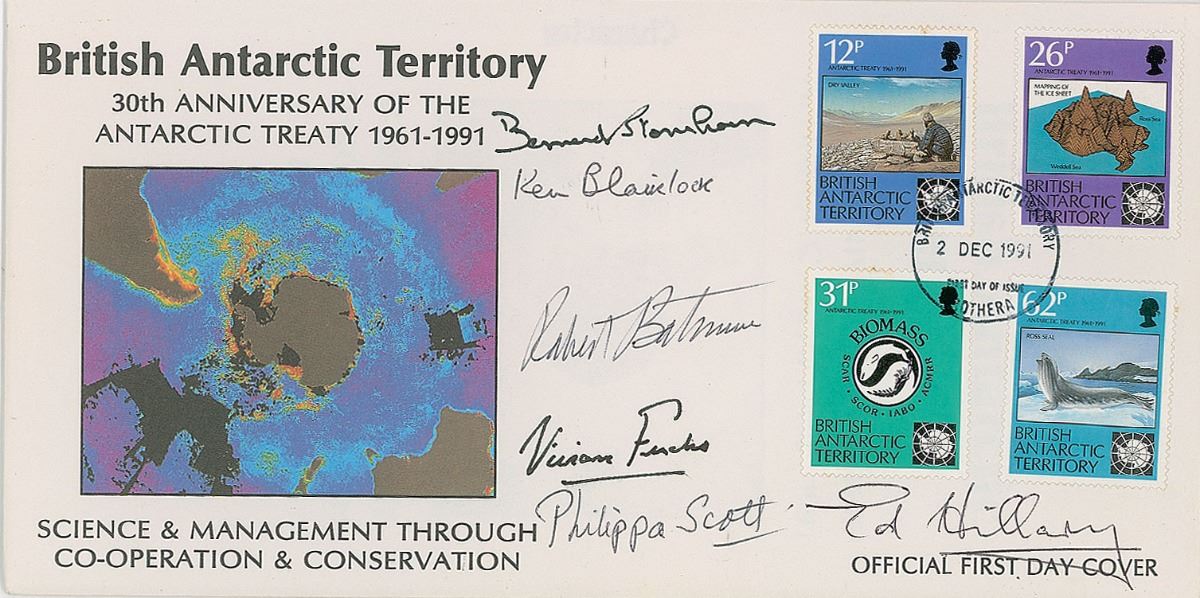 FDC, 8.5 x 4.25, with a cachet honoring the 30th anniversary of the Antarctic Treaty, signed in black ink or ballpoint by Bernard Stonehouse, Ken Blaiklock, Vivian Fuchs, Phillipa Scott, Edmund Hillary, and Robert Bateman. In fine condition.