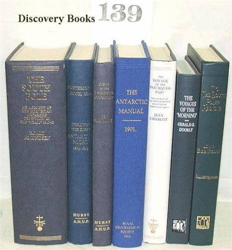 Antarctic. Modern reprints (1) Amundsen, Roald. THE SOUTH POLE. AN ACCOUNT OF THE NORWEGIAN ANTARCTIC EXPEDITION IN THE "FRAM", 1910-1912. London: reprinted 1976 Two vols in one. 392; 449pp. Illus, maps. Cloth, very good. (2)Cook, Frederick A. THROUGH THE FIRST ANTARCTIC NIGHT 1898-1899. London reprinted 1980 478pp. Photo illus. Cloth, very good. (3) Borchgrevink, C. E. FIRST ON THE ANTARCTIC CONTINENT. BEING AN ACCOUNT OF THE BRITISH ANTARCTIC EXPEDITION 1898-1900. London: reprinted 1980. Illus, 2 folding maps. Cloth, very good. (4) Murray, George, editor. THE ANTARCTIC MANUAL FOR THE USE OF THE EXPEDITION OF 1901. Plaistow, West Sussex, n.d. One of 500 copies. xvi,586pp. 3 folded maps. Cloth, as new. (5) Charcot, Jean. THE VOYAGE OF THE 'POURQUOI-PAS?'. THE JOURNAL OF THE SECOND FRENCH SOUTH POLAR EXPEDITION, 1908-1910. London, reprinted 1978 vi,vii,315pp. Illus. Cloth, as new in d/j. (6) Doorly, Gerald S. THE VOYAGES OF THE 'MORNING' England: 1995 224pp. Illus, map. Cloth, as new. (7) Bernacchi, Louis. TO THE SOUTH POLAR REGIONS. EXPEDITION OF 1898-1900. England: reprinted 1991 xvi,348pp. Illus, 2 folding maps, folding panorama. Cloth, as new. One of 450 copies. (7)