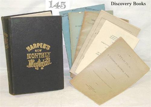 Antarctica. Author's separates/pamphlets. (1) Forbes, Henry O. ANTARCTICA. A VANISHED AUSTRAL LAND. From the Smithsonian Report for 1894. Washington, DC, 1896 pp.297-316 Grey printed wrapper. (2) Marchat, J. THE ANTARCTIC QUESTION. VOYAGES TO THE SOUTH POLE SINCE 1898. From the Smithsonian Report for 1908. Washington, DC, 1909 pp.451-480 Folding map. Grey printed wrapper. (3) Priestley, Sir Raymond. TWENTIETH-CENTURY MAN AGAINST ANTARCTICA. Presidential Address delivered to the British Association for the Advancement of Science at Sheffield, August 29, 1956 Reprinted from "The Advancement of Science", Vol XIII, No.50, Sept 1956. Pp.1-16 Printed wrapper. Signed by Priestey on front. (4) Mawson, Sir Douglas. SOUTH AUSTRALIAN PARTICIPATION IN ANTARCTIC EXPLORATION. Reprinted from the Proceedings of the Royal Geographical Society of Australia, S.A. Branch. No date 6pp. Folded map. Printed wrapper. (5) Griffiths, G. S. ANTARCTIC EXPLORATIONS. From the Smithsonian Report for 1890. Washington, DC 1891 pp.293-304 Printed wrapper. (6) Gould, Laurence M. MY 50 YEARS OF ANTARCTIC EXPLORATION AND RESEARCH. Antarctican Society Memorial Lecture, 19 April 1979 (6pp.) Printed wrapper. (7) Charcot, Jean B. MY ANTARCTIC EXPLORATIONS. In two parts, contained in Harper's Magazine, June- November, 1905. Pp.600-608 & 899-906 Photo illus. Both parts included in complete bound volume CXI, ….. Plus two others, similar. All very good. (9)