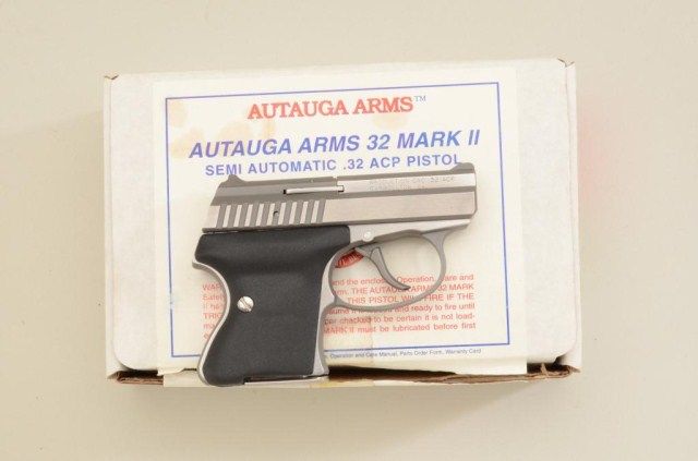 Antauga Arms MK II DA semi-auto pistol, .32 cal., near new in box, scarce. Est.: $175-$350.