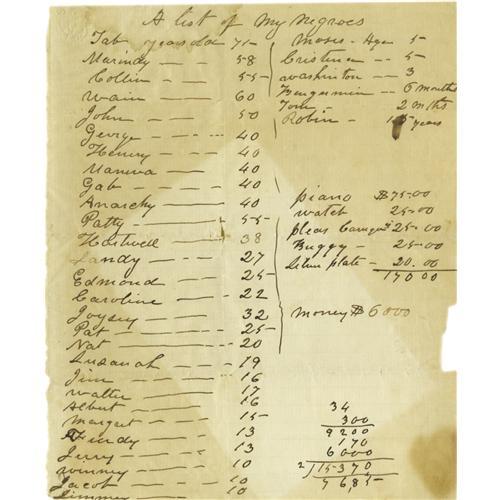 <B>Antebellum Estate Inventory Itemizing Slaves.</B></I> Manuscript document, "<I>A list of my negroes</B></I>", one page, 7.5" x 9.75", n.p., n.d. Thirty-four named slaves are noted here with ages ranging from 2 months to seventy-five years. Most of these individuals have commonplace names; however, a forty year-old of unknown gender is identified as "<I>Anarchy</B></I>"! A piano, $6000 cash, a watch, a carriage, a buggy, and some silver plate augment the $9200 value placed upon the slaves. Browning, two stains, and a small area of paper loss along the right edge. Bold and legible. Overall good condition.<BR><BR><b>Shipping:</b> Small Flat (<a target="_blank" href="http://www.heritageauctions.com/common/shipping.php">view shipping information</a>)