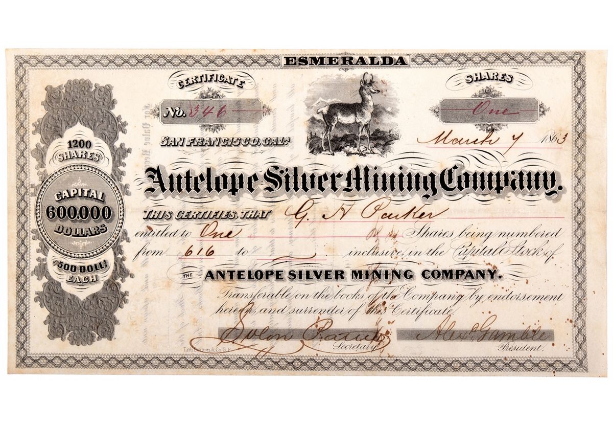 Incorporated in California in 1861, with San Francisco dateline. Cert. #346, issued March 7 to G.H. Parker for one share. Signed by Alex Gamble, President, and by S. Patrick, Secretary. Beautiful antelope vignette at top center. Black border and print on cream paper. U/C. Printer: Britton & Co, Lith. The Antelope was one of the earliest locations in Aurora, located on Silver Hill. It was considered one of the richest mines there, with newspaper editors continuously quoting high prices for the stock through at least 1863, according to the editors of the Mark Twain Letters. The ore mined during Clemens` time was found to be "low grade" at $50 per ton (hardly low grade by any stretch of the imagination to a professional mining person). The Antelope was the subject of several of Sam Clemens’ letters. In a letter of 4 May 1862 to his brother Orion, Sam mentioned that he and his partners had measured the strike and dip of the Antelope vein at the mine, and would try to stake claims on the continuation of it. "We may find it and we may not. The thing has often been tried before, but with no success. If we find it, our fortunes are made-if we don`t, -they ain`t." "I have 75 feet in a spur of the Antelope, which promises nothing save that it is an offshoot from a good family - and I am aristocrat enough to attach some importance to that sort of thing... Send me some money. If the article is scarce, $20 will do...." Clemens noted that he had found a "ledge" the next day but was not sure if it was the extension of the Antelope. By June, Clemens had the First North Extension of the Antelope staked, telling his brother 11 May 1862 that he owned a fifth of the claim. Low was a mining investor with an office on Montgomery Street in San Francisco, perhaps a relative of the California Governor [Mark Twain`s Letters, Vol. I, 1988, p. 202] [Ref: SF Directory, 1865]. 5" x 9” XF. Maish Collection. - Maish Collection -58963