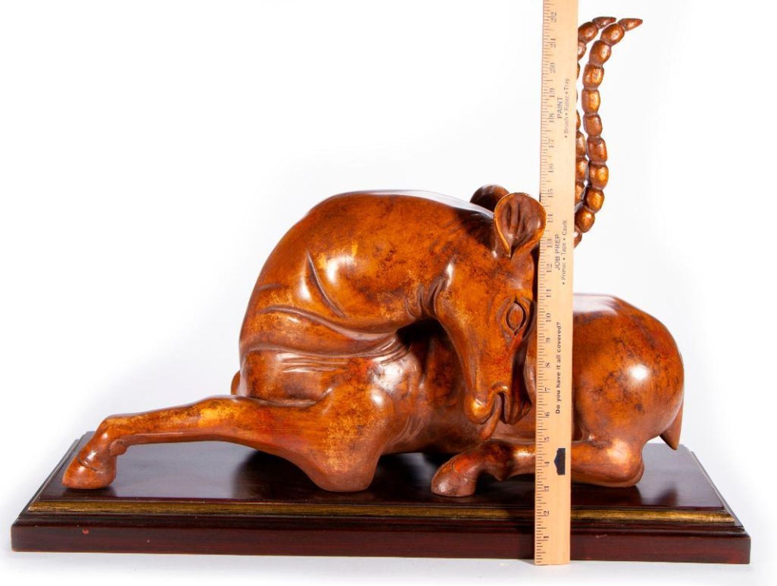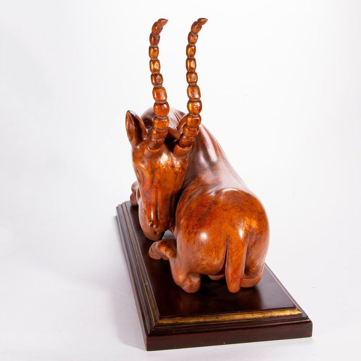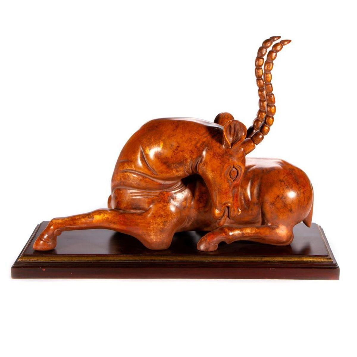 A composite antelope sculpture on stand. H - 21" W - 30 1/4" D - 12". Condition: Good.
