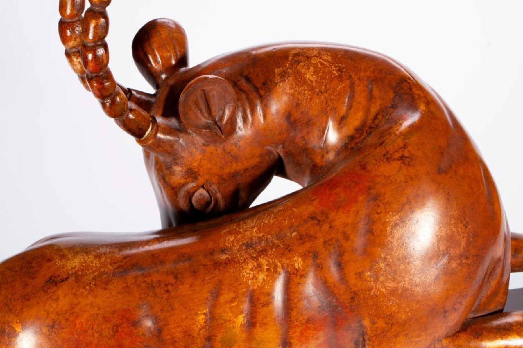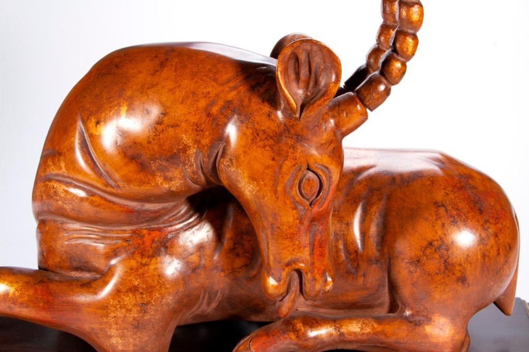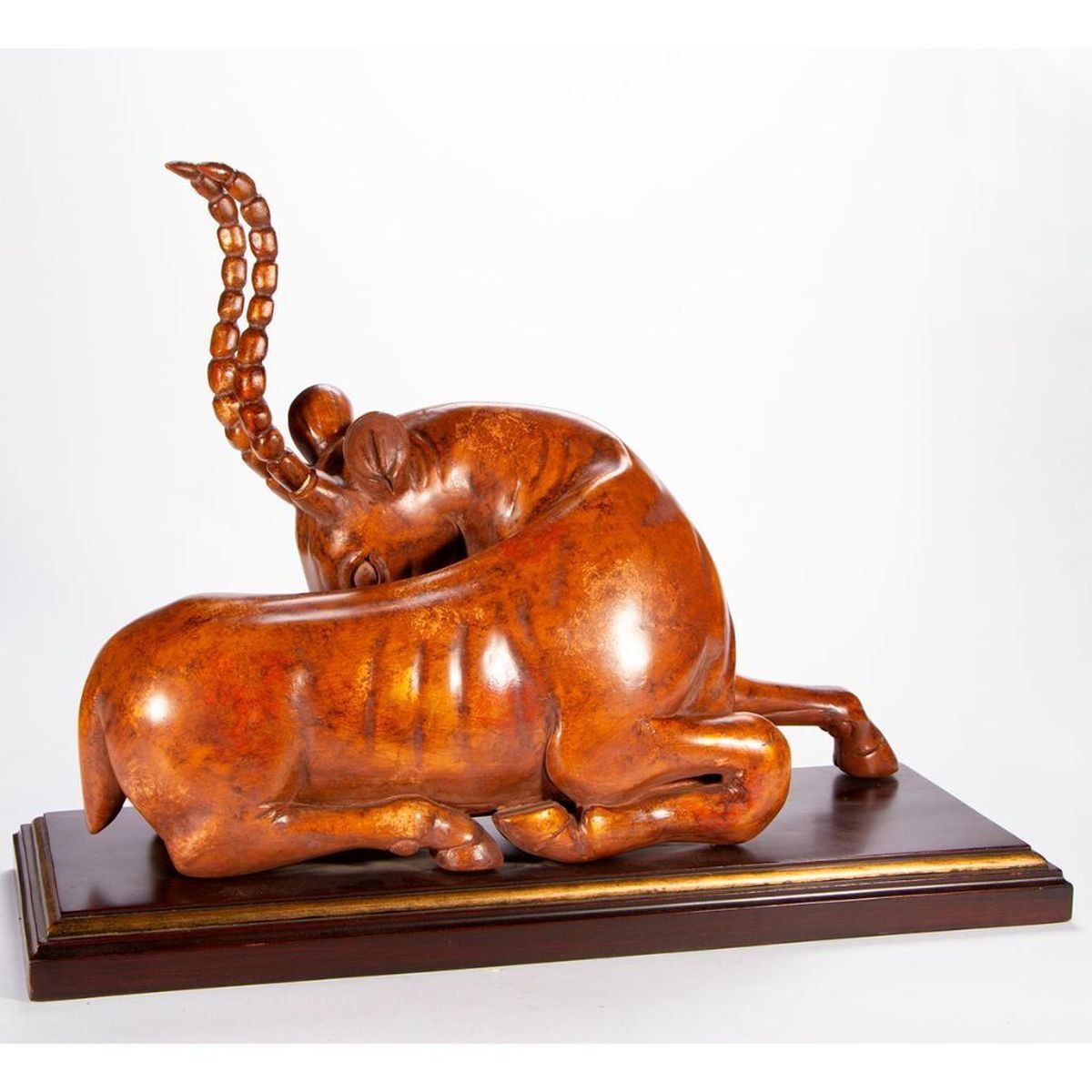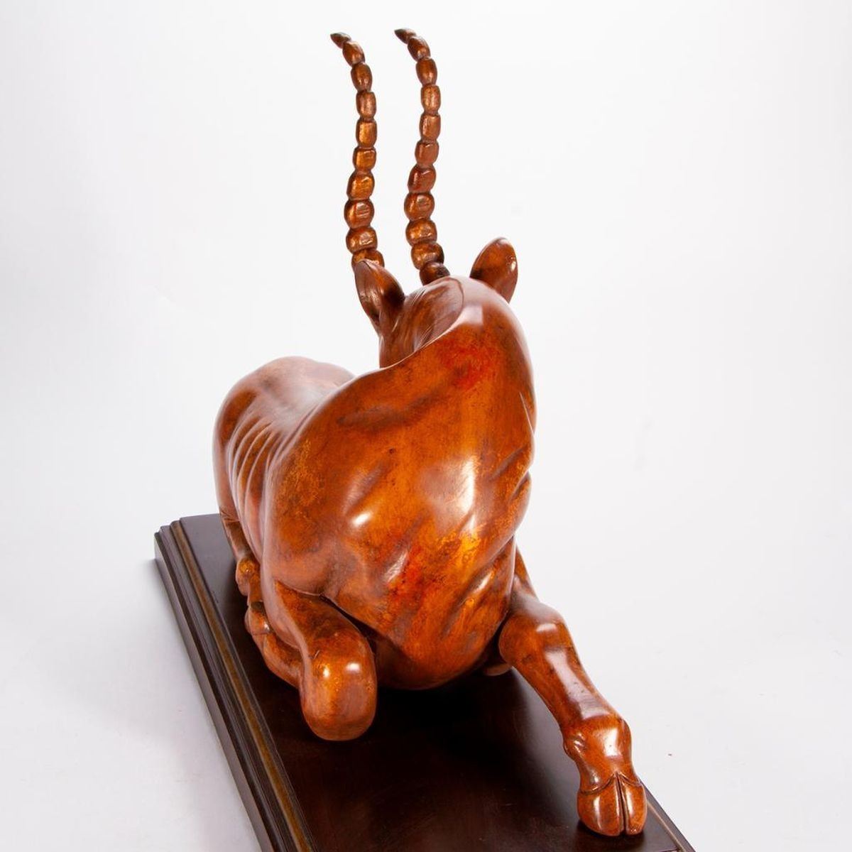 A composite antelope sculpture on stand. H - 21" W - 30 1/4" D - 12". Condition: Good.