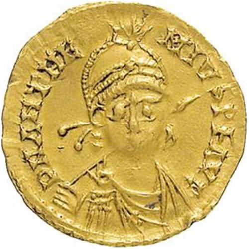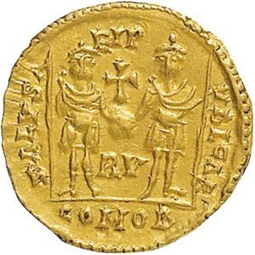 Roman Empire Coins. Antemio (467-472). Solido, Ravenna. D/ DN ANTHEMIVS P F AVG. Busto elmato tre quarti di fronte, con paludamentum e lancia. R/ SALVS REIPVBLICAE. I due imperatori Leo ed Antemio, stanti di fronte, tengono fra di loro un globo crucigero. Sotto il globo, RV. In esergo: COMOB. LRC 920. RIC 2881 (R4). Lacam pl. 109. gr. 4.34 RRRR. AU. SPL. Estremamente raro.
