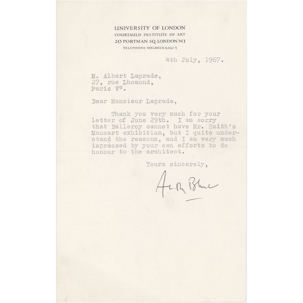 TLS, one page, 5 x 8, University of London letterhead, July 4, 1967. Letter to Albert Laprade, in part: "I am sorry that Balleroy cannot have Mr. Smith's Mansart exhibition, but I quite understand the reasons, and I am very much impressed by your own efforts to do honour to the architect." In fine condition.