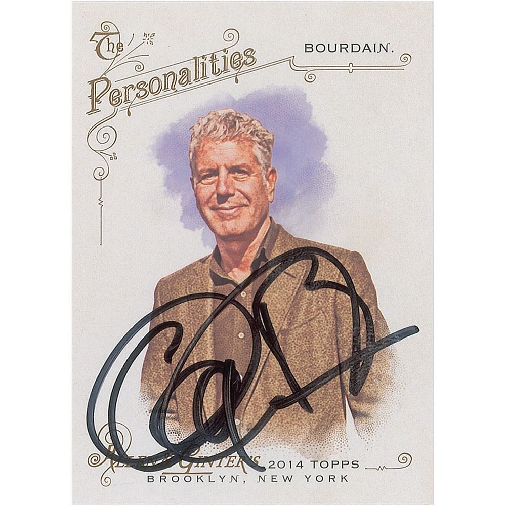 2014 Topps Allen & Ginter baseball card featuring famous chef, writer, and travel documentarian Anthony Bourdain, signed in black felt tip. In fine condition, with extremely subtle surface ripples along the top and bottom edges.