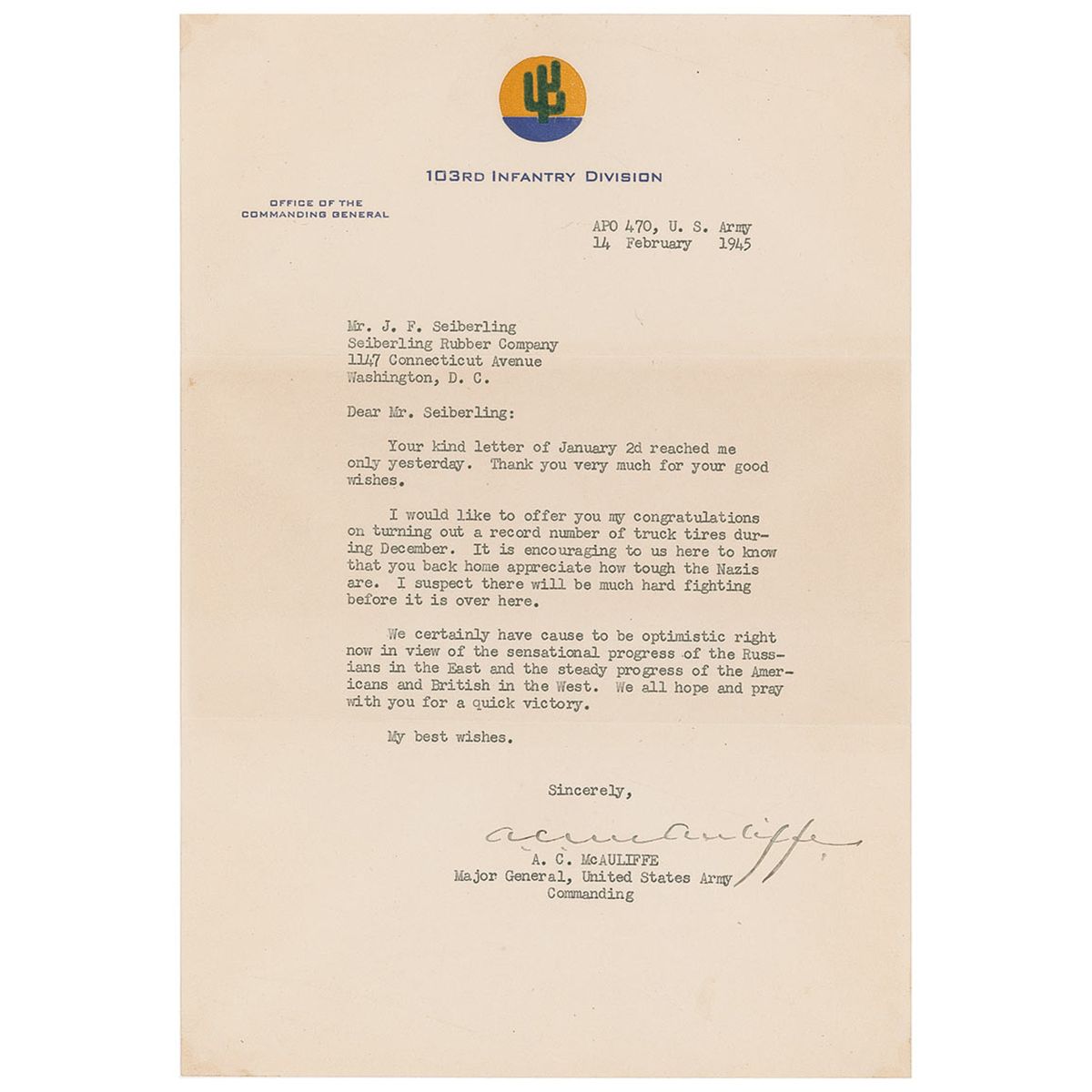 War-dated TLS signed “A. C. McAuliffe,” one page, 7.25 x 10.5, 103rd Infantry Division letterhead, February 14, 1945. In a letter to J. F. Seiberling of Seiberling Rubber Comany, McAuliffe writes, in full: “Your kind letter of January 2d reached me only yesterday. Thank you very much for your good wishes. I would like to offer you my congratulations on turning out a record number of truck tires during December. It is encouraging to us here to know that you back home appreciate how tough the Nazis are. I suspect there will be much hard fighting before it is over here. We certainly have cause to be optimistic right now in view of the sensational progress of the Russians in the East and the steady progress of the Americans and British in the West. We all hope and pray with you for a quick victory.” Light creasing and toning, and faint shadows at each corner from previous mounting, otherwise fine condition. Accompanied by the original mailing envelope.