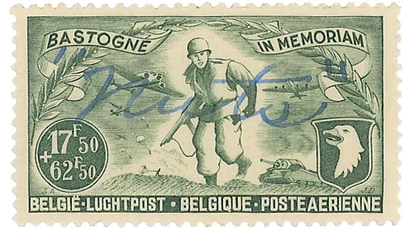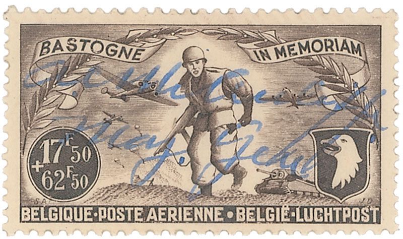 Two Belgian postage stamps honoring the fallen soldiers at Bastogne, both signed in fountain pen by McAuliffe, the first signed, “‘Nuts,’” and the second signed, “A. C. McAuliffe, Maj. Genl.” In overall fine condition, with moderate contrast to signatures against the busy background.