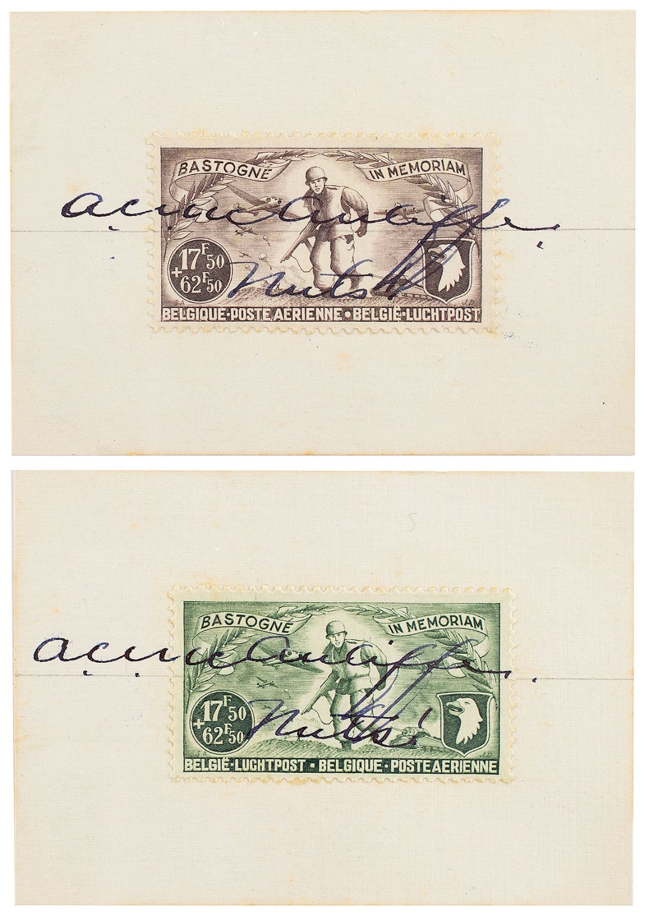 Two highly desirable vintage fountain pen signatures, "A. C. McAuliffe, Nuts,” over different denominations of Belgian postage stamps memorializing Bastogne affixed to off-white 3.5 x 2.5 cards. In fine condition.