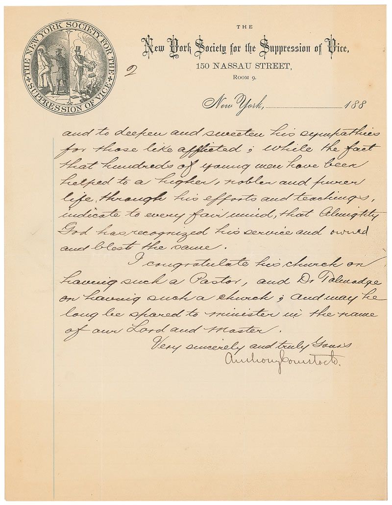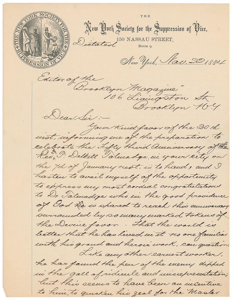 Politician dedicated to ideas of Victorian morality (1844–1915). LS, two pages, 7.75 x 10, illustrated New York Society for the Suppression of Vice letterhead depicting an arrest and book burning, November 22, 1884. Letter to Edward Bok, the editor of the Brooklyn Magazine. In full: “Your kind favor of the 20th inst, informing me of the preparation to celebrate the Fifty third Anniversary of the Rev Dr T. DeWitt Talmadge [sic], in your city on the 7th of January next, is to hand, and I hasten to avail myself of the opportunity to express my most cordial congratulations to Dr Talmadge who in the good providence of God is spared to reach this anniversary surrounded by so many marked tokens of the Divine favor. That the world is better that he has lived in it no one familiar with his grand and heroic work, can question.