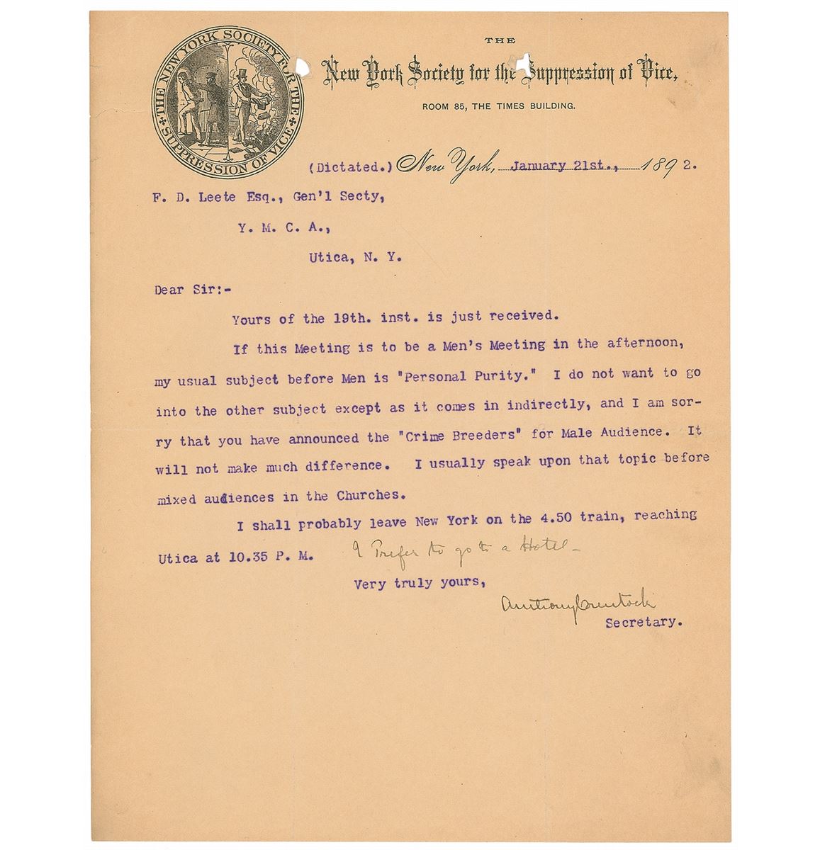 Politician dedicated to ideas of Victorian morality (1844–1915). TLS, one page, 8.25 x 10.75, New York Society for the Suppression of Vice letterhead, January 21, 1892. Letter to F. D. Leete at the YMCA. In part: “If this Meeting is to be a Men’s Meeting in the afternoon, my usual subject before Men is ‘Personal Purity’…I am sorry that you have announced the ‘Crime Breeders’ for Male Audience…I usually speak upon that topic before missed audiences in the Churches.” Intersecting folds (one vertical fold passing through a single letter of the signature), light soiling, a tear to the upper left edge, and punch holes to the top, otherwise fine condition.