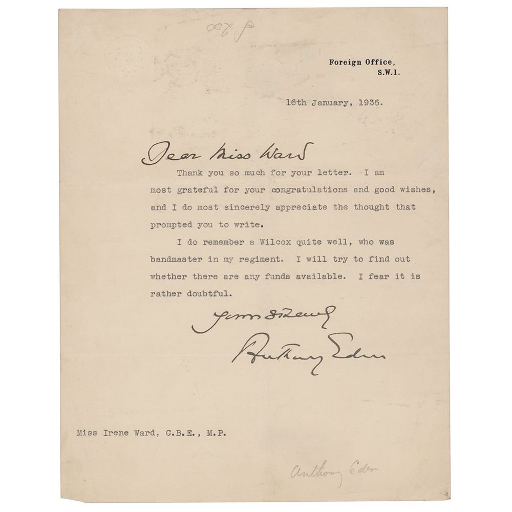 TLS signed ‰ÛÏYours sincerely, Anthony Eden,‰Û one page, 7.5 x 9.5, Foreign Office letterhead, January 16, 1936. Letter to Irene Ward, in full: "Thank you so much for your letter. I am most grateful for your congratulations and good wishes, and I do most sincerely appreciate the thought that prompted you to write. I do remember a Wilcox quite well, who was bandmaster in my regiment. I will try to find out whether there are any funds available. I fear it is rather doubtful." Eden adds the salutation in his own hand. In very good to fine condition, with light show-through from old mounting and clipping residue on the back.