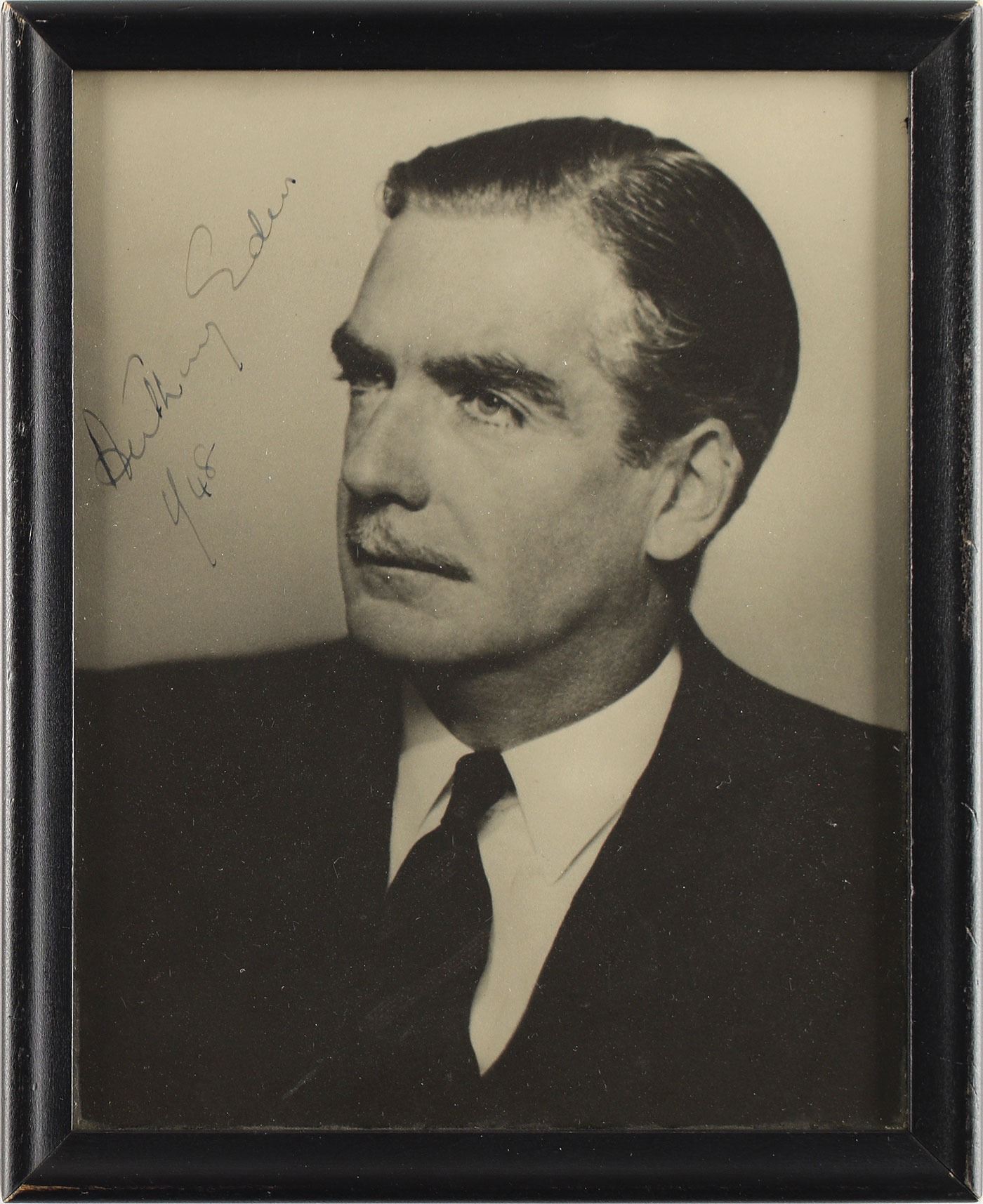 Vintage matte-finish 5.75 x 7.25 photo of the UK prime minister in a suit and tie, signed in fountain pen, "Anthony Eden, 1/48." Framed and in fine condition.