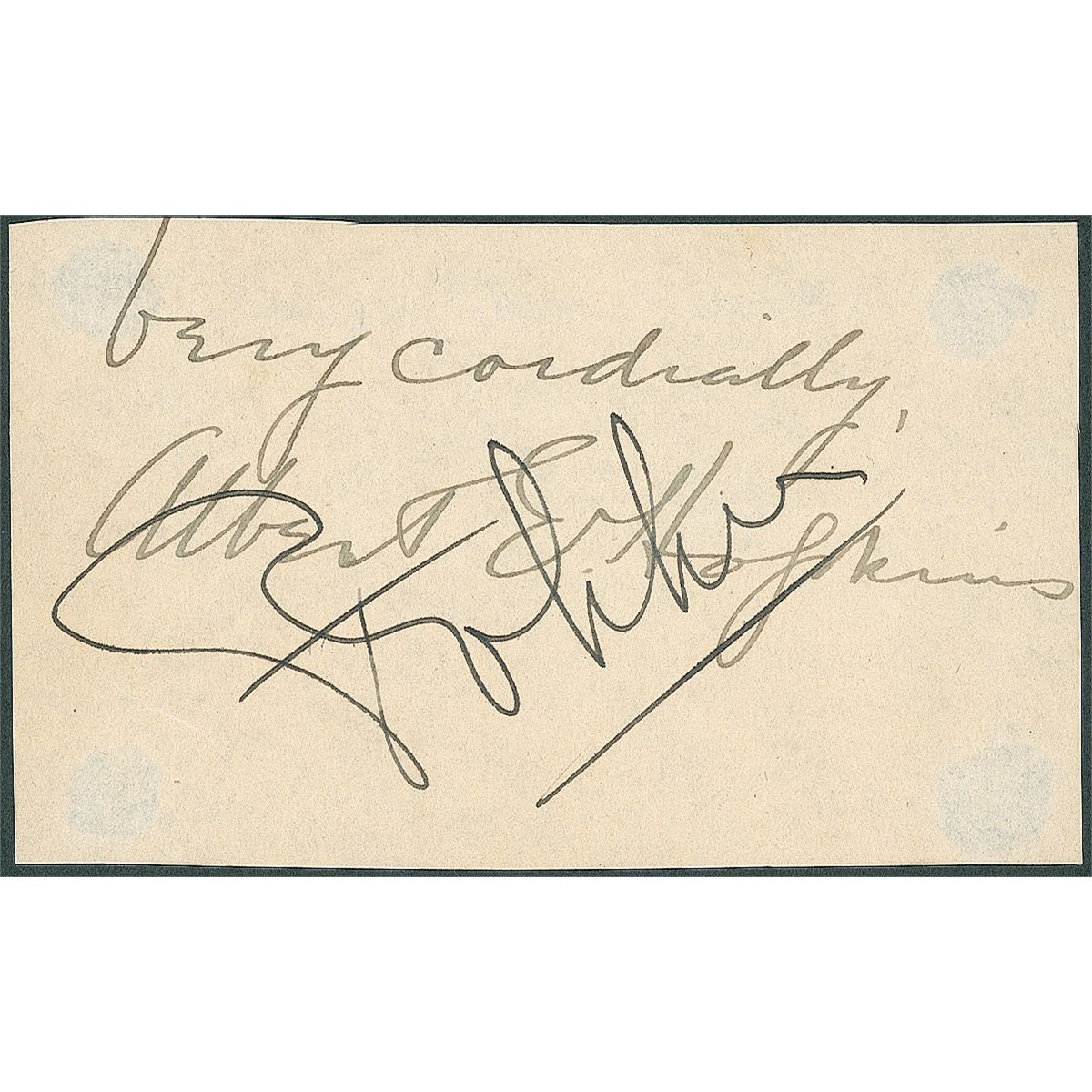 Dutch-American aircraft manufacturer (1890–1939) who, among other innovations, designed the Fokker Dr. I triplane, the plane made famous by “Red Baron” Manfred von Richthofen, and the synchronization gear that allowed the firing of a machine qun through the spinning propellor of combat aircraft. Vintage ink signature, “Fokker,” on an off-white 3.75 x 2 clipped slip. Card is affixed to an 8 x 10.5 scrapbook page along with a clipped photo of Fokker. Fokker’s signature over a signature of Albert Hopkins, otherwise fine condition.