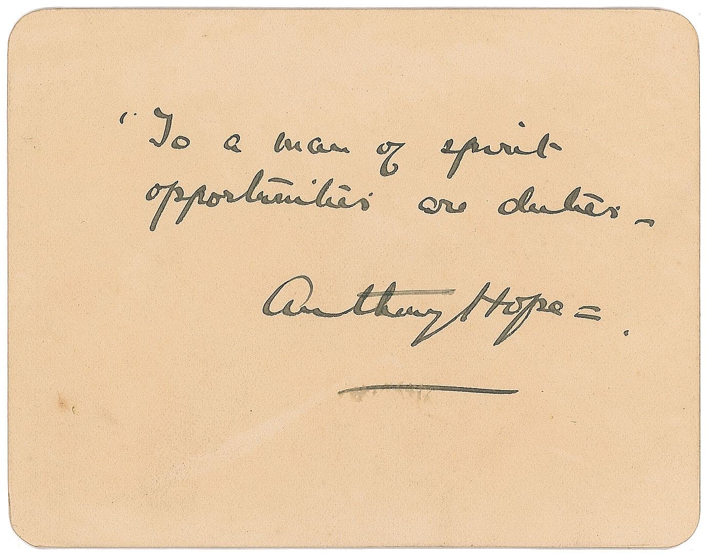 Prolific English novelist and playwright (1863–1933) who is best remembered for the minor classic The Prisoner of Zenda and its sequel Rupert of Hentzau. Wonderful AQS from the 1894 adventure novel The Prisoner of Zenda on an off-white 4.5 x 3.5 card, in full: "'To a man of spirit, opportunities are duties,' Anthony Hope." In fine condition.