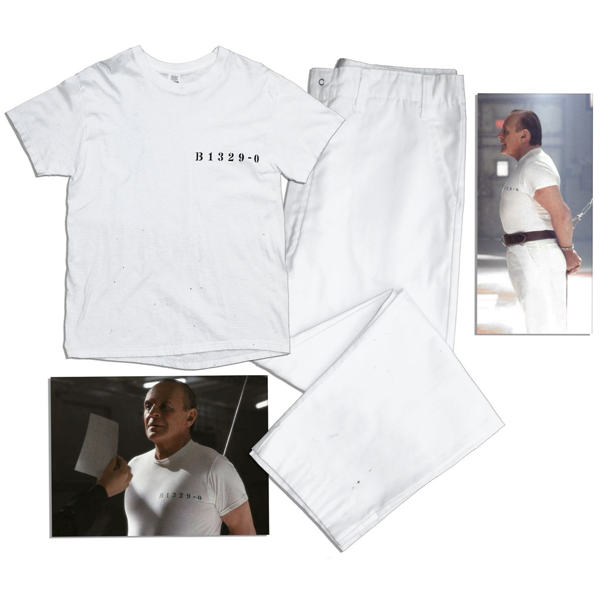Anthony Hopkins jail costume as serial killing cannibal Hannibal Lecter in ''Red Dragon'', the prequel to ''Silence of the Lambs''. Wardrobe ensemble comprises a white t-shirt with inmate number B1329-0 in black print across the chest and a pair of white denim pants labeled ''Lecter 38'' on the tag. Shirt by Fruit of the Loom is a size L. Pants are 35 x 29. Scattered small stains likely production caused to shirt and pants, else near fine. With a COA from Premiere Props and tag from Profiles in History.