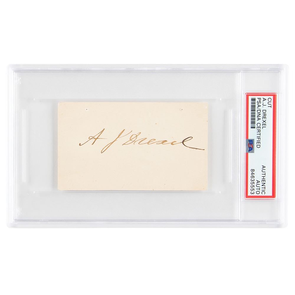 Scarce fountain pen signature, "A. J. Drexel,†on an off-white 3.75 x 2.25 card. In fine condition. Encapsulated in a PSA/DNA authentication holder.