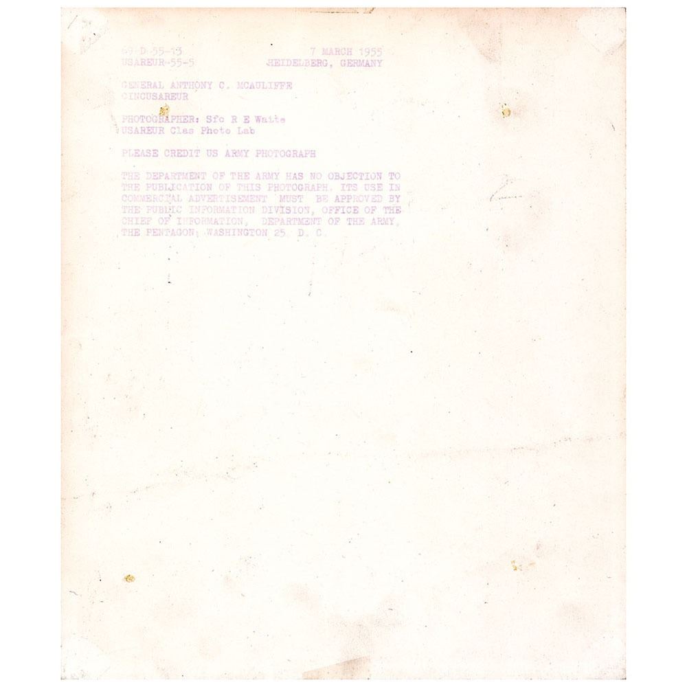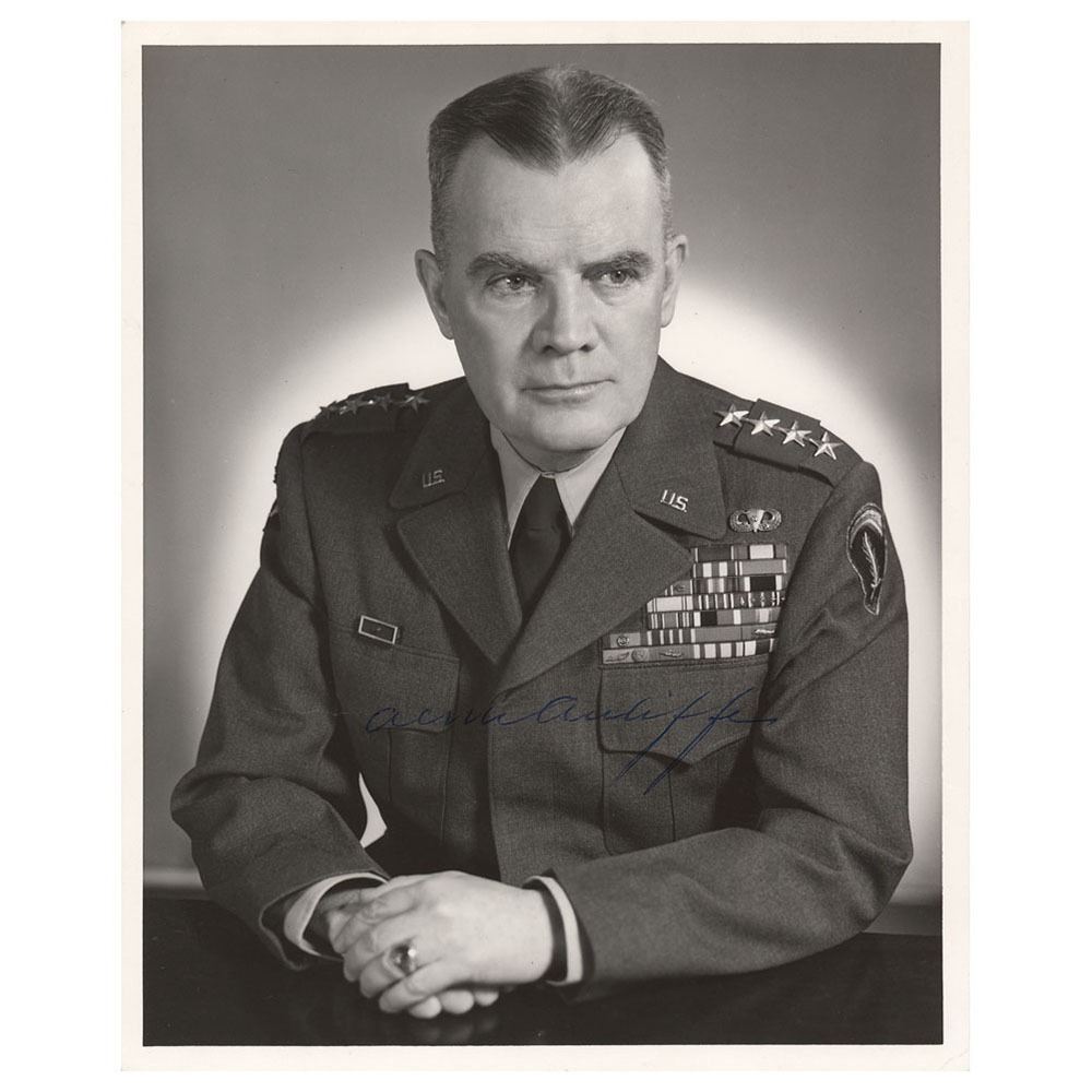 Matte-finish 8 x 10 portrait of the four-star US Army general, signed in blue ballpoint, "A. C. McAuliffe." Reverse bears faded Army credit captions. In fine condition, with a slight crease to the left of the signature.