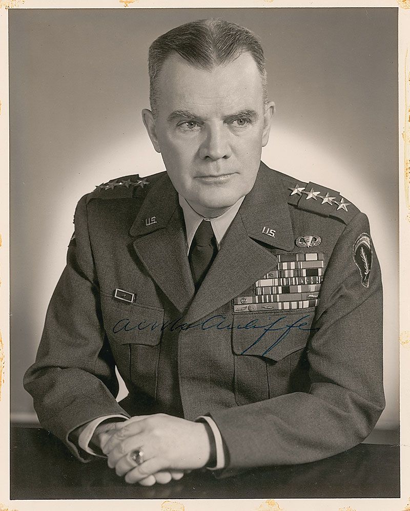 United States Army general (1898–1975) who commanded the force defending Bastogne, Belgium, during the Battle of the Bulge in World War II. He was famous for his brief reply to a German surrender ultimatum: ‘Nuts!’ Scarce matte-finish 8 x 10 portrait of McAuliffe in his decorated US Army uniform, signed in blue ballpoint, “A. C. McAuliffe.” In fine condition, with mounting and adhesive remnants to edges, and a small tear to lower right edge (all of which could be easily matted out).