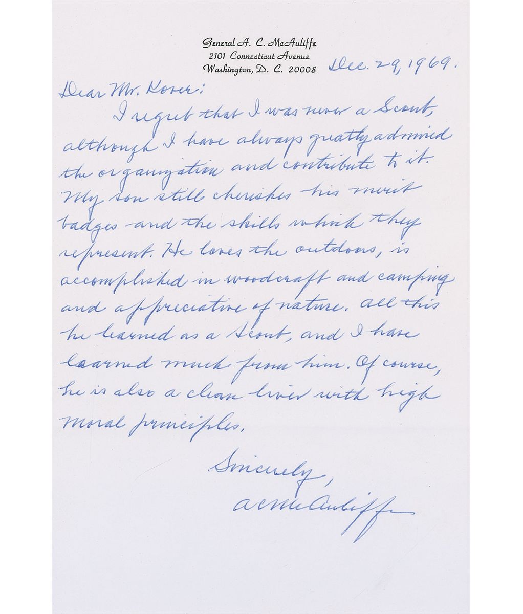 United States Army general (1898–1975) who commanded the force defending Bastogne, Belgium, during the Battle of the Bulge in World War II. He was famous for his brief reply to a German surrender ultimatum: ‘Nuts!’ Interesting ALS signed “A. C. McAuliffe,” one page, 7.25 x 10.5, personal letterhead, December 29, 1969. Letter to a gentleman. In part: “I regret that I was never a Scout, although I have always greatly admired the organization and contribute to it. My son still cherishes his merit badges and the skills which they represent. He loves the outdoors, is accomplished in woodcraft and camping and appreciation of nature. All this he learned as a Scout, and I have learned much from him. Of course, he is also a clean liver with high moral principles.” In fine condition.