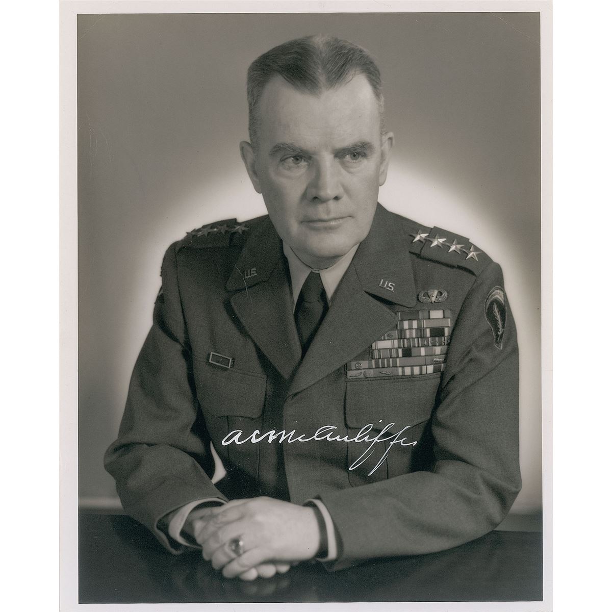 United States Army general (1898–1975) who commanded the force defending Bastogne, Belgium, during the Battle of the Bulge in World War II. He was famous for his brief reply to a German surrender ultimatum: ‘Nuts!’ Matte-finish 8 x 10 portrait of McAuliffe in his decorated US Army uniform, signed in white ink, “A. C. McAuliffe.” Stamped on the reverse with a caption and US Army credit. In fine condition, with creasing to left edge and upper corners.