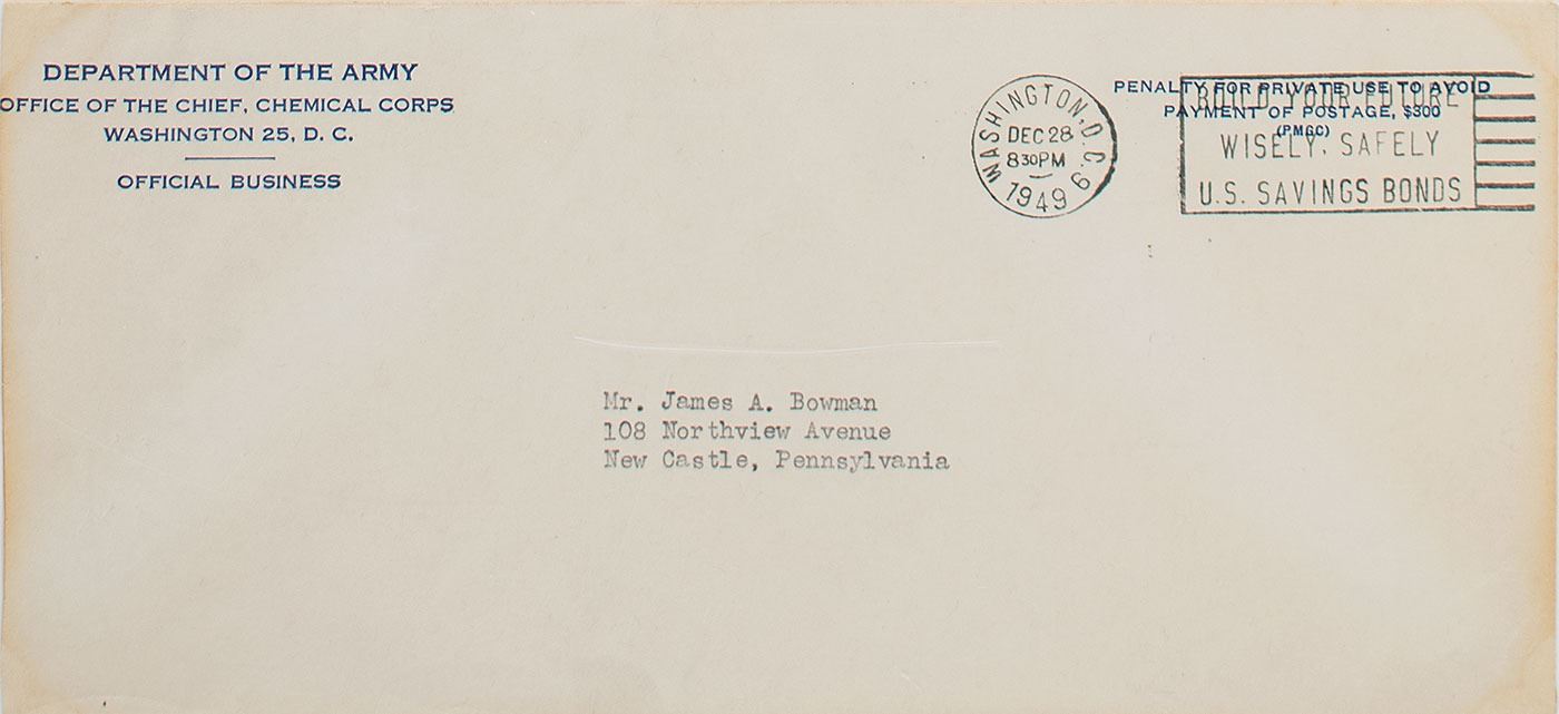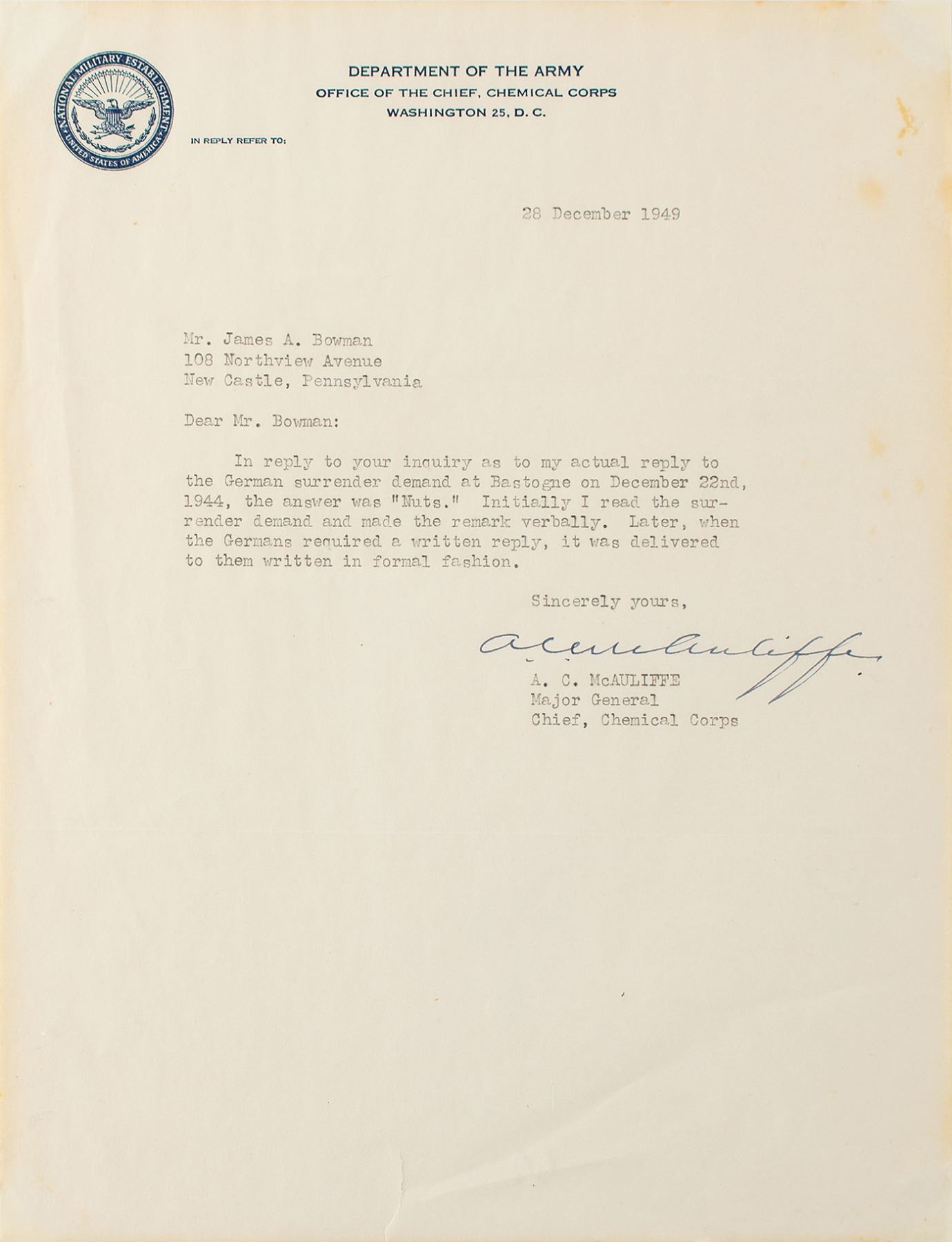 TLS signed “A. C. McAuliffe,” one page, 8 x 10.5, Department of the Army letterhead, December 28, 1949. Letter to James A. Bowman, in part: "In reply to your inquiry as to my actual reply to the German surrender demand at Bastogne on December 22nd, 1944, the answer was 'Nuts.' Initially I read the surrender demand and made the remark verbally. Later, when the Germans required a written reply, it was delivered to them written in formal fashion." In very good to fine condition, with creasing (primarily to the lower blank area), some small stains, and a tear to the bottom edge. Accompanied by the original mailing envelope.