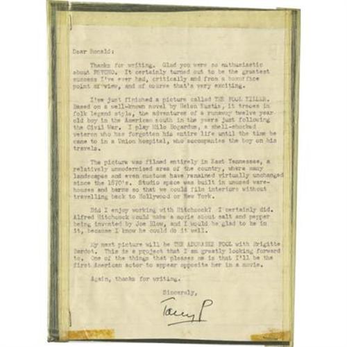 <B>Anthony Perkins Signed Letter.</B></I> A one-page letter to a fan, undated but written circa 1964, typed and signed "Tony P" by the actor in black ink. Perkins mentions working with Alfred Hitchcock on <I>Psycho,</B></I> completing <I>The Fool Killer,</B></I> and looking forward to working with Brigitte Bardot in <I>The Adorable Fool.</B></I> Trimmed and in Very Good to Fine condition, with tape remnants to the bottom corners and encased in plastic. <I>Accompanied by LOA from PSA/DNA.</B></I><BR><BR><b>Shipping:</b> Flat Material, Small (<a target="_blank" href="http://www.heritageauctions.com/common/shipping.php">view shipping information</a>)