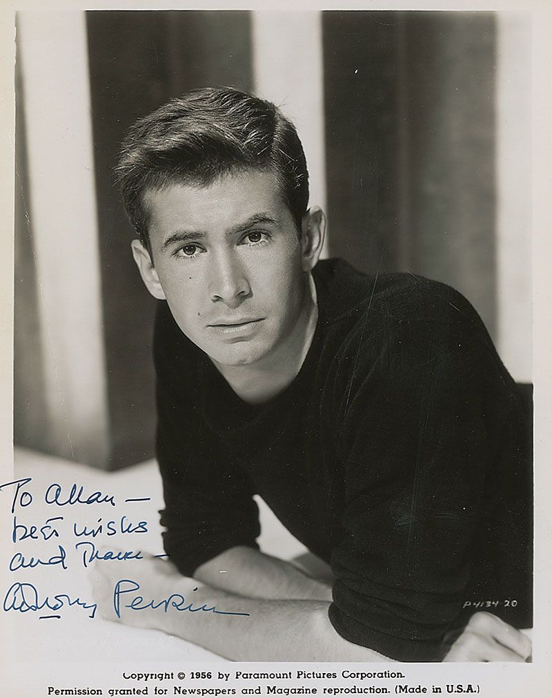 Youthful vintage glossy 8 x 10 Paramount publicity photo of Perkins as a 24-year-old actor in 1956, signed and inscribed in fountain pen, “To Allan—best wishes and thanks—Anthony Perkins.” In very good condition, with a significant diagonal crease down the left side, passing through the inscription and signature.